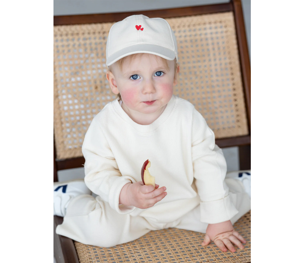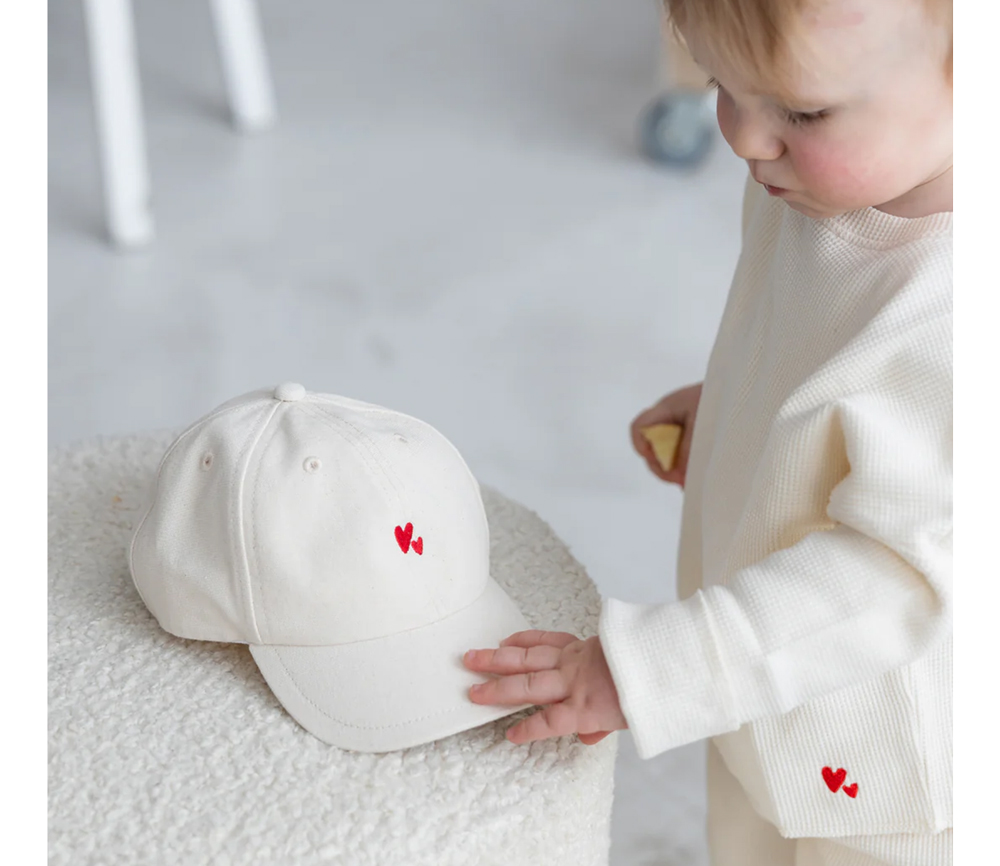 Canvas Cap für Kinder von 1-3 oder NEU 4-6 Jahren aus Bio-Baumwolle mit Herz-Details für den idealen Mutter Tochter Partnerlook, Vater Sohn Partnerlook oder die ganze Familie. Auch unsere Kinder Cap besticken wir mit unserem Herz-Logo auf der Vorderseite. Die coole Cap ist der perfekte Begleiter für sonnige Tage und ergänzt jeden Partnerlook. In unserer Lieblingsfarbe Tofu lässt sich die Baseball Cap einfach mit allen Outfits kombinieren.