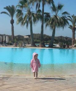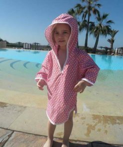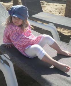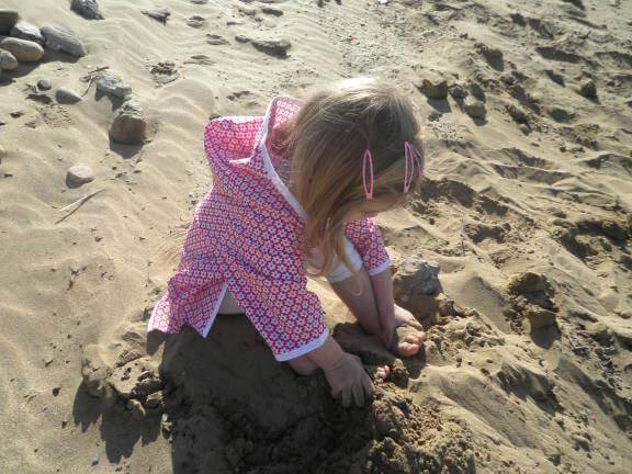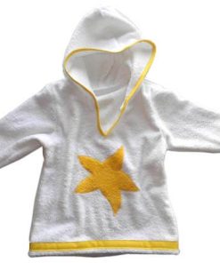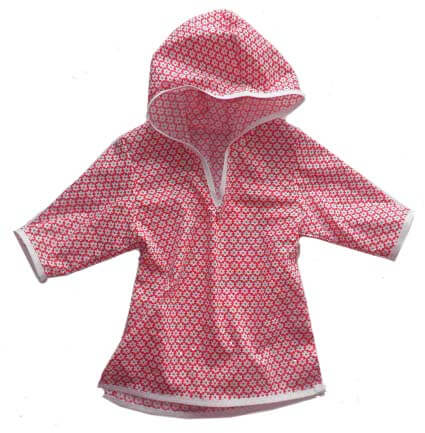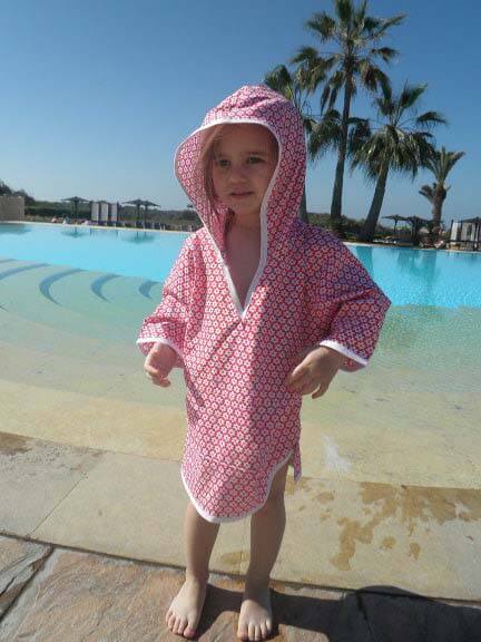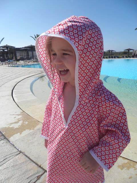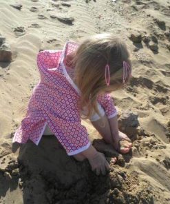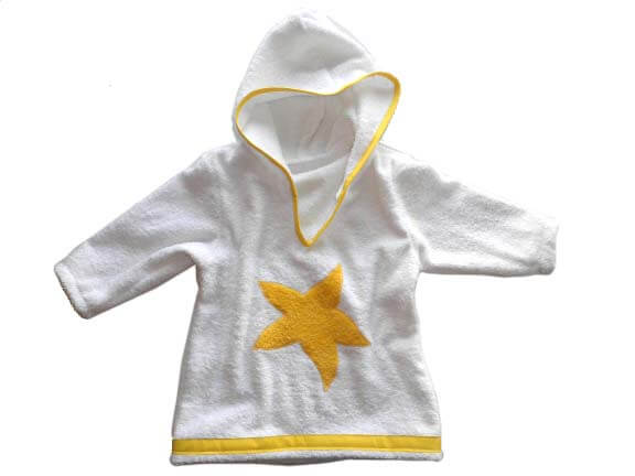 Dieses Kleid ist sehr einfach zu nähen und ist zudem auch noch sehr praktisch. Ob im Schwimmbad oder am Strand, das Teil ist vielseitig zu gebrauchen und kann aus unterschiedlichsten Stoffen genäht werden. Es gibt die Option das Kleid mit einer aufgesetzten Tasche oder Seestern Applikation zu nähen. Den Frotteestoff gibt es hier.