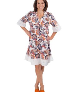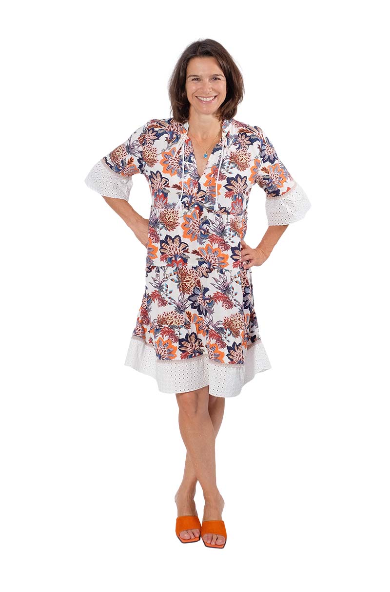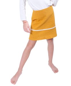 Hochwertiger Baumwollstoff mit Lochstickerei. Ideal für Kleider, Blusen, Röcke und vieles mehr. Abbildung Schnittmuster Rock Heidi in Farbe Senf und Kleid Hera in Jeansblau. Mit dem Stoff kann man auch das Schnittmuster Francesca verarbeiten, entweder ganz aus Stoff oder nur einzelne Bahnen.