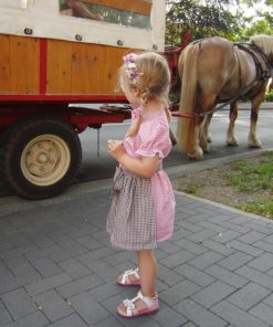 Ein wunderschönes Vichykaro in Rot / Ecru. Dies ist ein WEBSTOFF, d.h. Vorder- und Rückseite sind gleich. Abbildung Schnittmuster Latzkleid Berit und Dirndl Rock Freda und Bluse Bonnie in roter Farbstellung . Abbildung Schnittmuster Theresa und Rock Larissa zur Inspiration in anderen Farben.