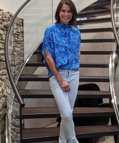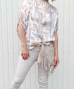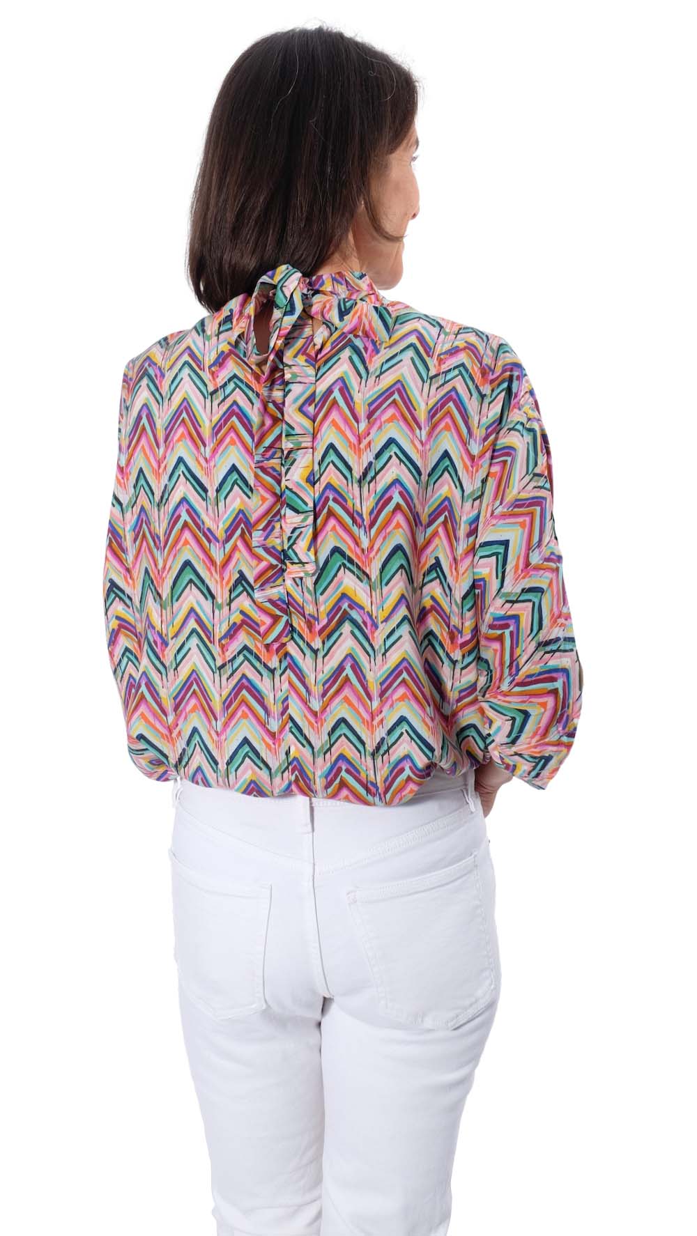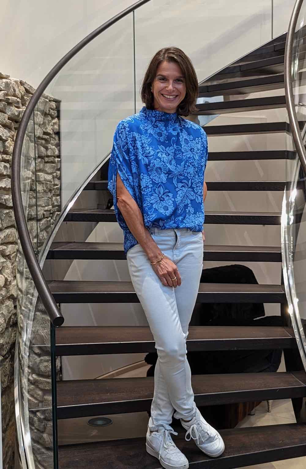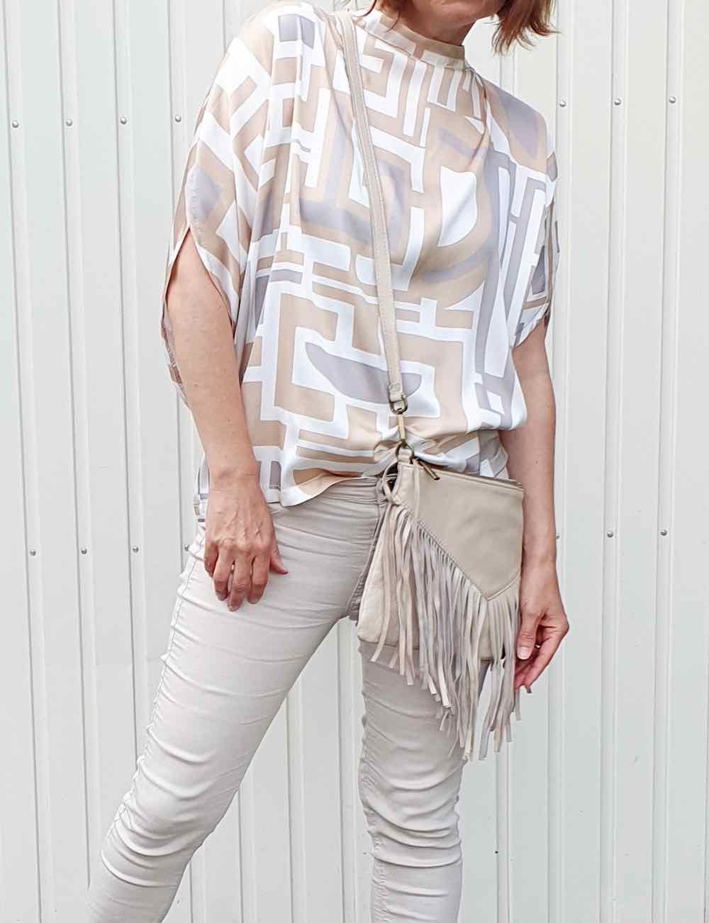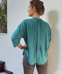 Dieses raffinierte Bluse ist ein toller Begleiter durch das ganze Jahr. Sie wird mit Bindeband oben gehalten und im Rücken geknotet, ohne Knopf und ohne Reißverschluss. Die Hose Frieke ist eine tolle Kombination dazu!