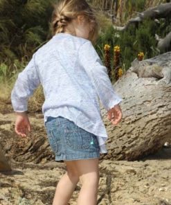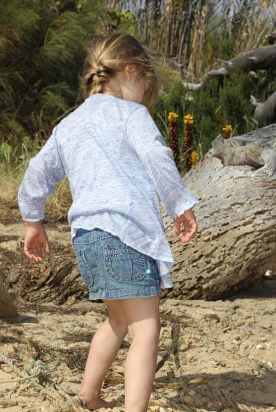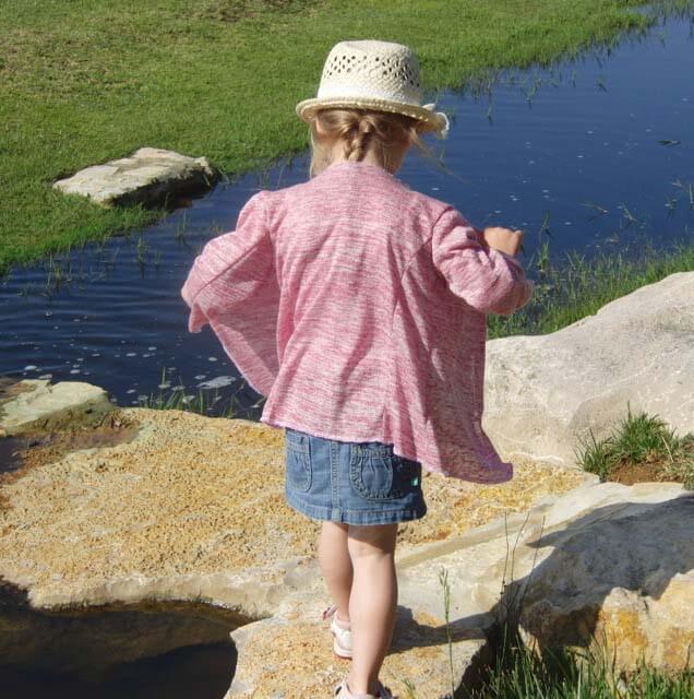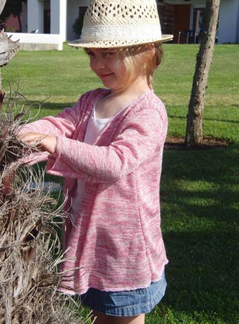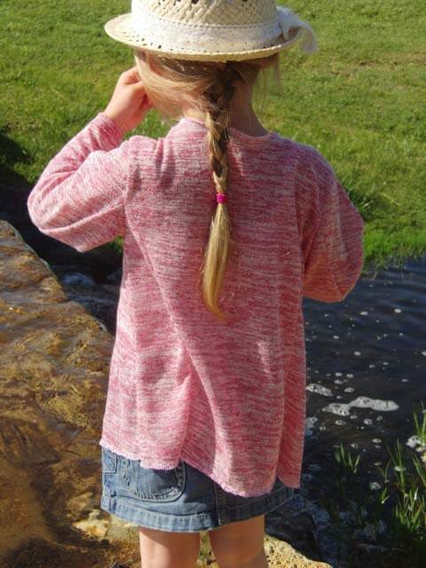 Diese Jacke sieht nicht nur hübsch aus, sie ist auch ganz einfach genäht… Diese Jacke ist ein tolles Projekt für Anfänger! Einzig und alleine die Stoffwahl kann das Projekt etwas schwieriger machen. Diese Jacke lebt durch das Material. Bitte hier ein leicht fallendes, weiches und dehnbares Material nehmen. Idealerweise franst es nicht aus, sonst musst Du nämlich die Kanten nämlich am Ende rundherum versäubern. Die linke Warenseite wird später beim Tragen sichtbar sein, hier bitte auch darauf achten.