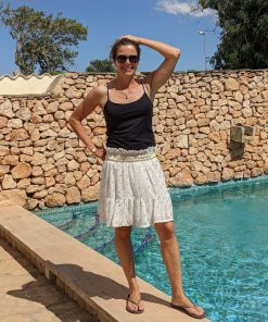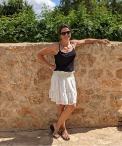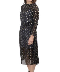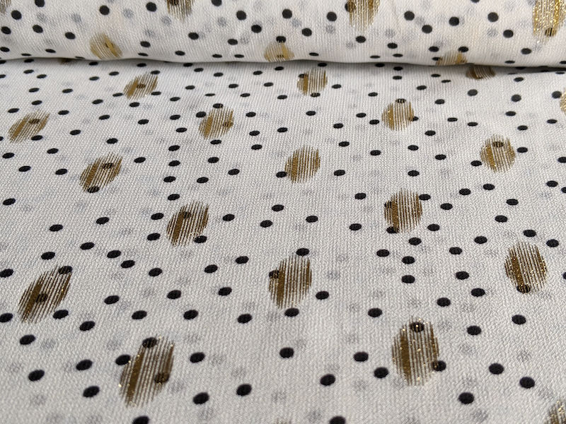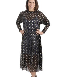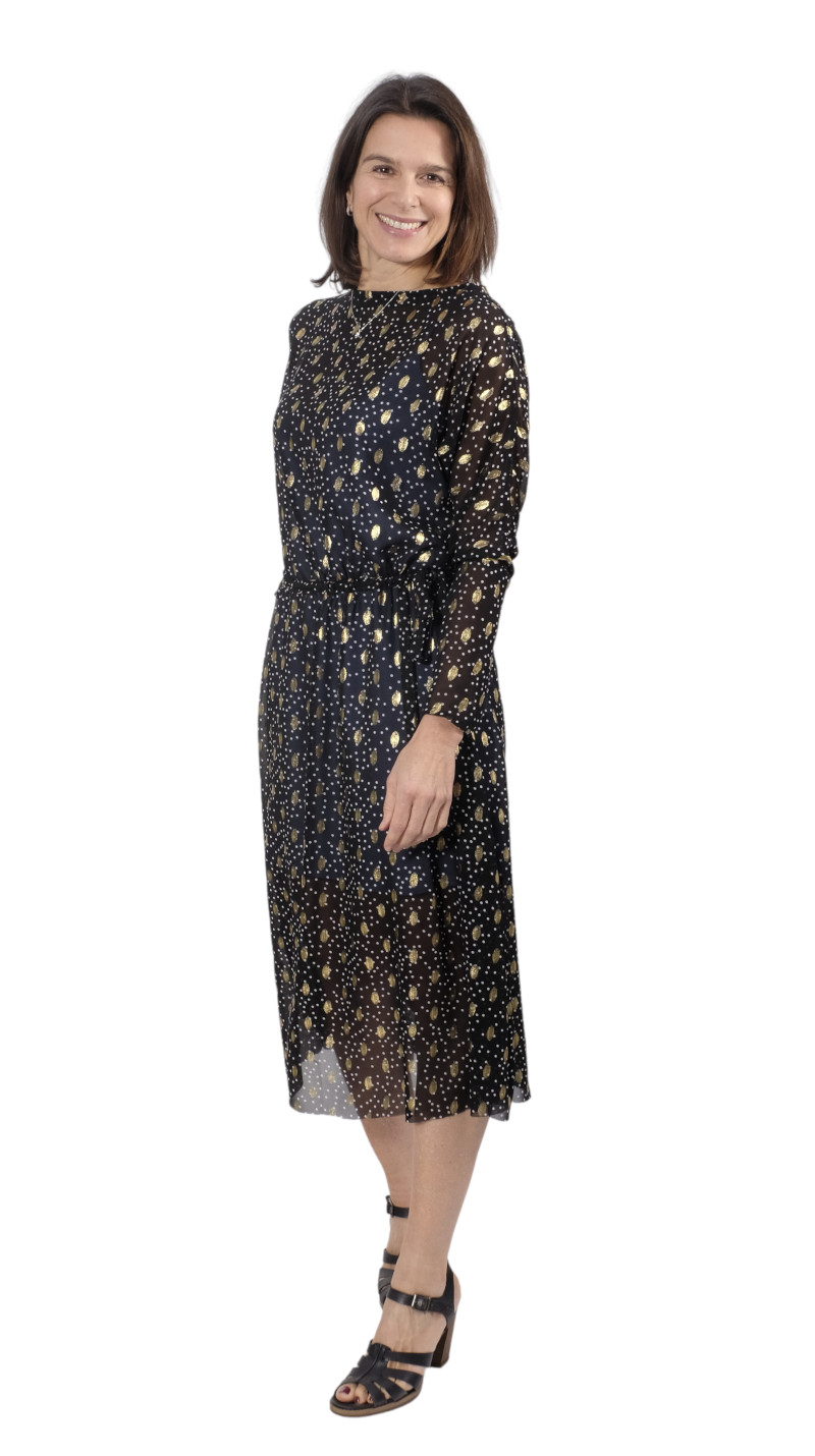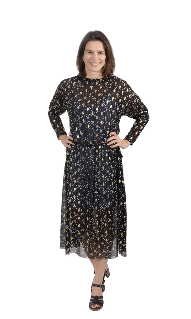 Hochwertiger Chiffon in Schwarz mit goldener Musterung. Ideal für Kleider, Blusen, Röcke und vieles mehr. Achtung, der Artikel ist nicht blickdicht und sollte bei Röcken abgefüttert werden. Abbildung Schnittmuster Rock Edina und Kleid Carmen in Schwarz.