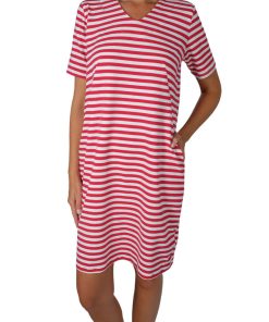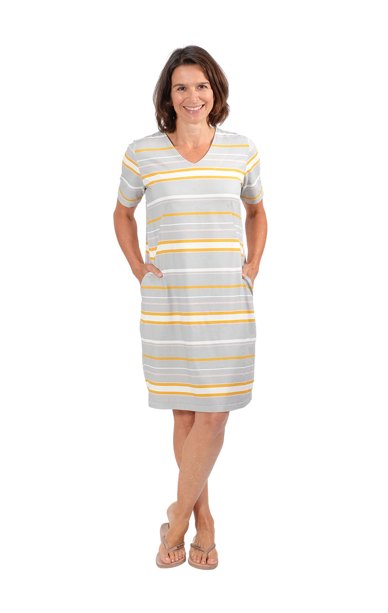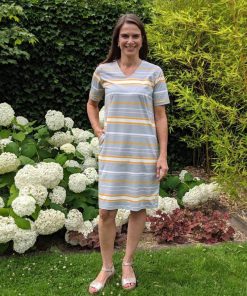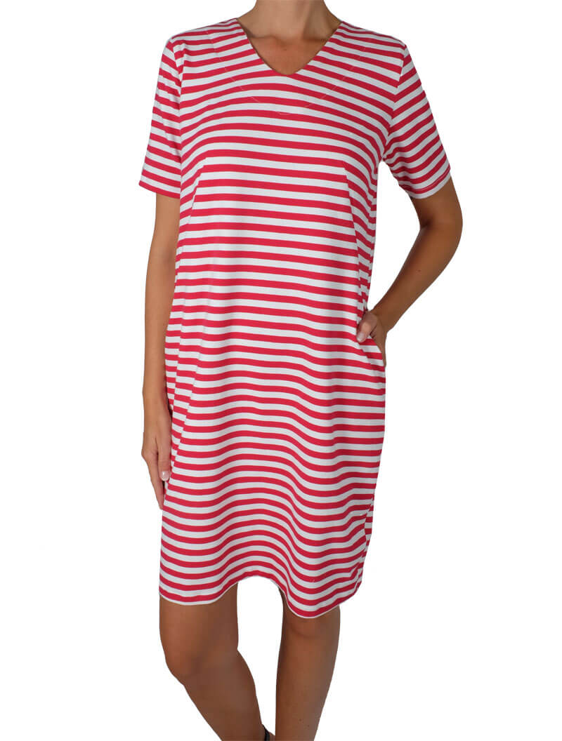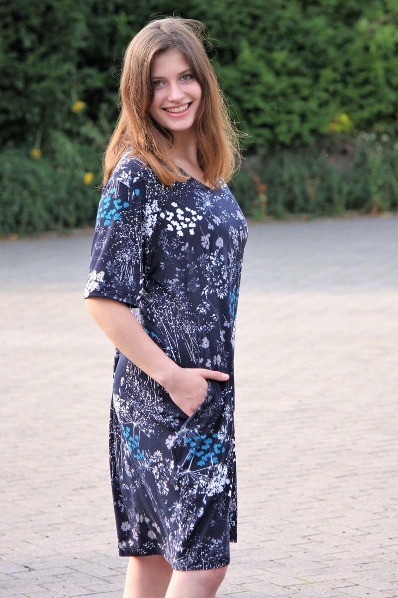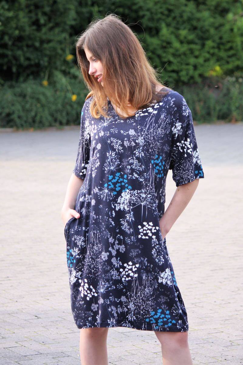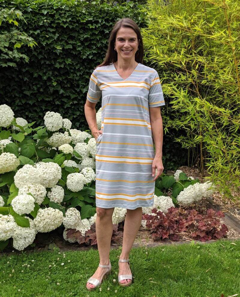 Jerseykleider für Damen nähen! Ein Schnittmuster für ein einfaches, aber schönes Jerseykleid welches durch die im Abnäher eingearbeiteten Taschen raffiniert aussieht. Durch die Auswahl des Stoffes wird das Damenkleid immer wieder anders aussehen. Gerade aus einem Streifenstoff sieht es toll aus, aber natürlich kannst Du auch unifarbene Stoffe verwenden. Wenn Du die Tasche weglässt, ist das Kleid auch für Nähanfänger geeignet.