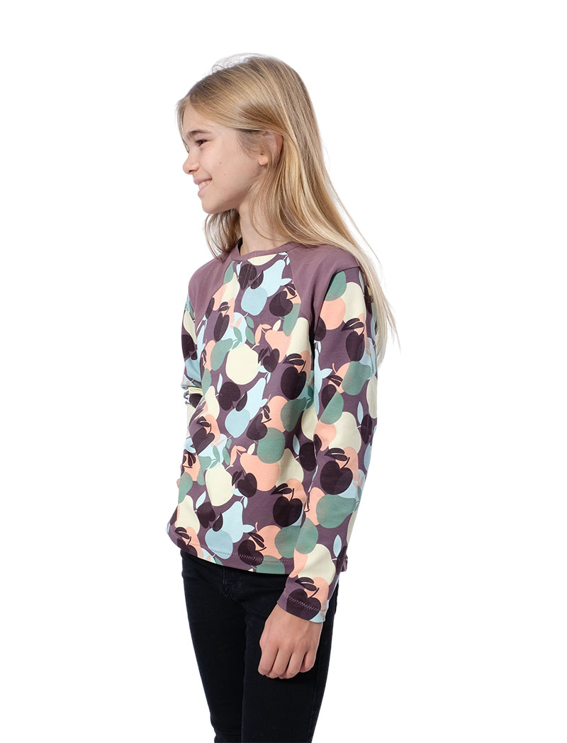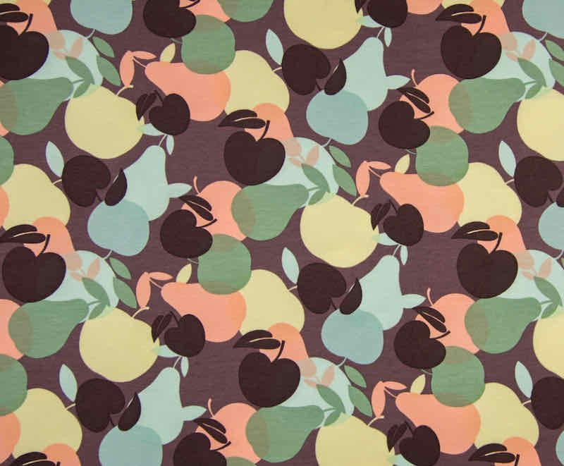 Ein hochwertiger French Terry Stoff aus Baumwolle/Elasthan mit Äpfeln bedruckt. Die Innenseite ist nicht angeraut. Ideal zum Nähen von Kinderbekleidung, Kleider, Shirts, Mützen, Loopschals, Pumphosen und vieles mehr. Abbildung Shirt Andy.