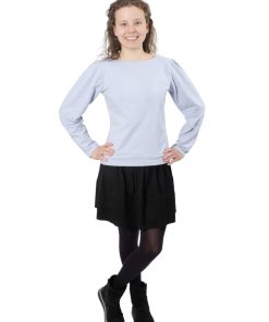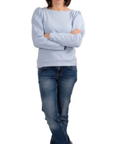 Ein hochwertiger French Terry Stoff aus Baumwolle/Elasthan in Hellblau. Die Innenseite ist kuschelig weich, da sie angeraut ist. Ideal für Shirts, Hosen, Röcke und Kleider. Abbildung Schnittmuster Shirt Bernice. Abbildung Schnittmuster Harriet in einer Nuance dunkl.er
