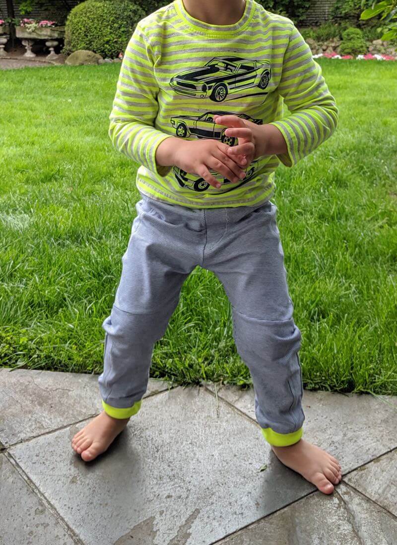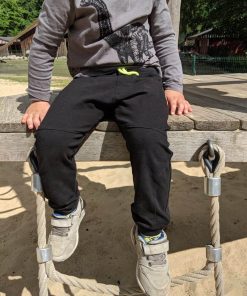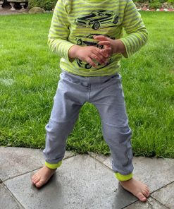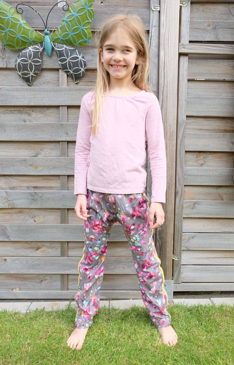 Diese unkomplizierte Hose ist eine tolle, lässige Hose für Jungs und Mädchen. Hier kannst Du schön mit verschiedenen Stoffen spielen oder auch eins unserer tollen Bänder aufsetzen. So wird die Hose immer wieder anders aussehen. Durch die Teilungsnähte wird das Schnittmuster aber auch in unifarben pfiffig.