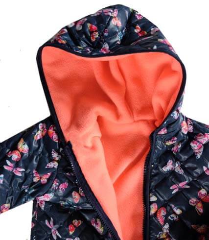 Diese hübsche Kinderjacke kann grundsätzlich aus allen Stoffen genäht werden. Ob mit oder Schrägband, im Ebook wird alles ganz genau erklärt. Anfänger mit wenig Erfahrung sollten zuerst stabile Stoffe wählen. Denn gerade beim Einnähen des Reißverschlusses ist es hilfreich, wenn sich der Stoff wenig verziehen kann. Sehr gut eignen sich hier Softshell oder stabile Wollstoffqualitäten. Für dieses Modell benötigst Du teilbare Reißverschlüsse. Die Länge ist unten angegeben. Empfehlenswert ist für diese Jacke die Verwendung von doppelseitigem Klebeband. Im Ebook erklären wir auch noch, wie man die Jacke aus 2 Stoffen nähen kann. Nehme z.B. einen wattierten Steppstoff für die Außenjacke und für die Innenjacke ein Fleece.