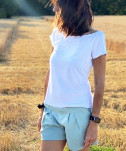 Ein hochwertiger Single-Jersey aus Bambus/Elasthan in Weiß. Der Jersey eignet sich ideal für Kleider, Shirts, Hosen, Beanie Mützen, Loopschals, Pumphosen und Jogginghosen. Der Jersey ist vom Fall und Griff her mit einem Viskosejersey zu vergleichen. Er trägt sich angenehm auf der Haut. Abbildung Schnittmuster Jumpsuit Hazel und Palazzohose Anya in Schwarz. Tonja in Pink, Adina in Grün. Wasserfallshirt Kat, Haremshose Naomi, Shirt Senta in anderen Farbstellungen. Abbildung Shirt Sue in Weiß.