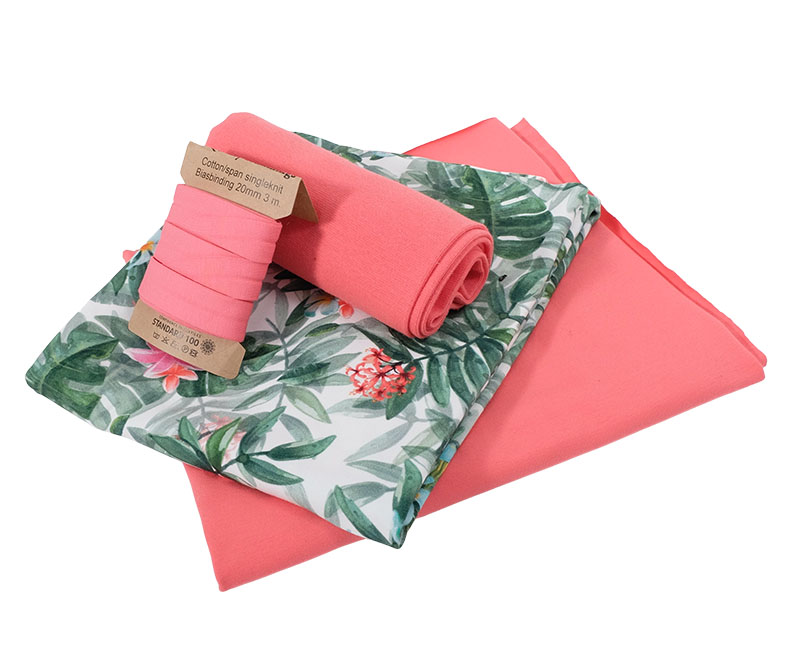 Das Stoffpaket beinhaltet 2 hochwertige Jersey Stoffe und einen Bündchenstoff aus Baumwolle/Elasthan aus einer Serie. Das ist alles dabei: