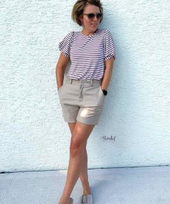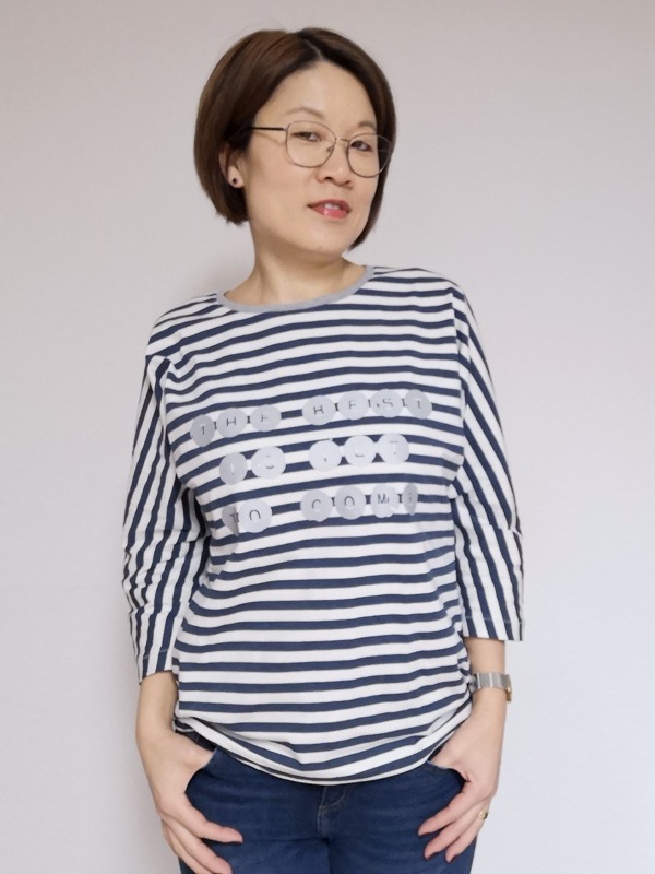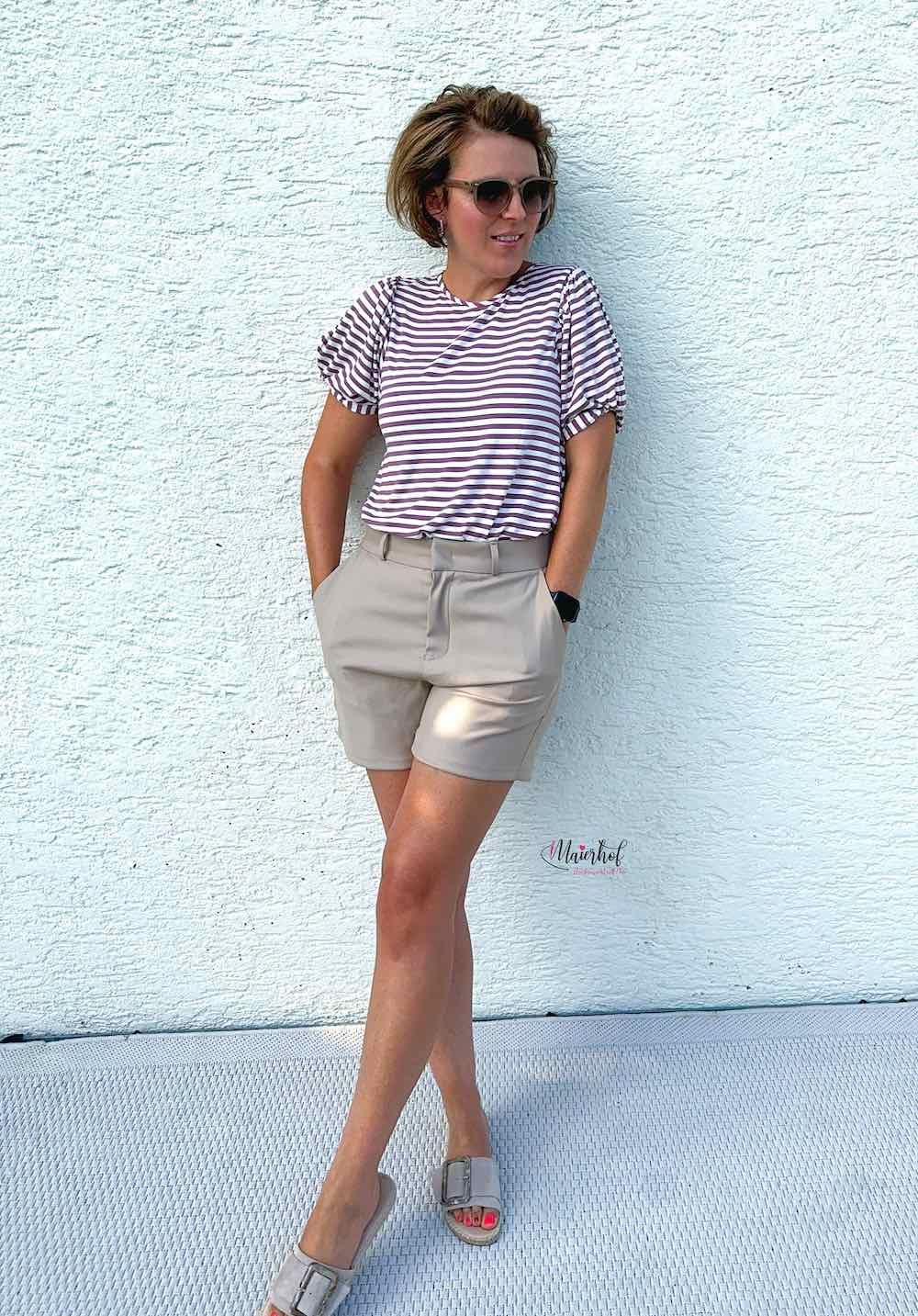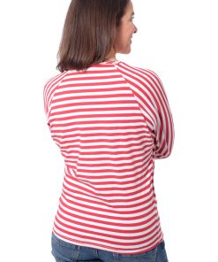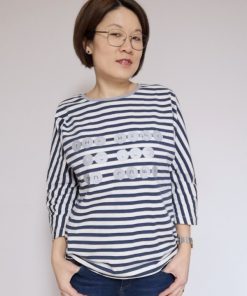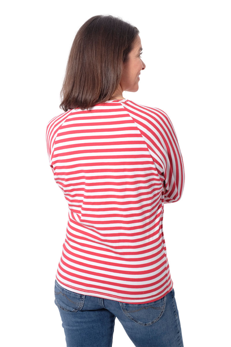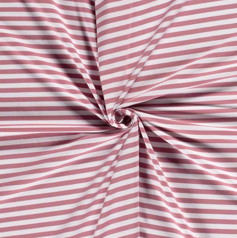 Ein hochwertiger Jersey mit mit Rosa-weißen Streifen, die je 1 cm breit sind, bedruckt. Das Material ist ideal für Shirts, Kleider Hosen, Pumphosen und Oberteile. Abbildung Schnittmuster Doro mit blauen breiten Streifen und andere SM zur Inspiration.