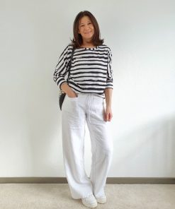 Ein hochwertiger Jersey mit mit schwarz-weißen Streifen, die je 1 cm breit sind, bedruckt. Das Material ist ideal für Shirts, Kleider Hosen, Pumphosen und Oberteile. Abbildung Schnittmuster Doro mit blauen breiten Streifen.