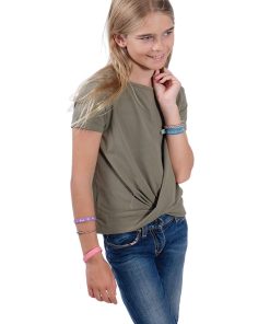 Ein hochwertiger Jersey Stoff aus Baumwolle/Elasthan in einem Oliv Grün. Das Material ist ideal für Mützen, Loopschals, Pumphosen und Oberteile. Abbildung Knotenshirt Aniko.