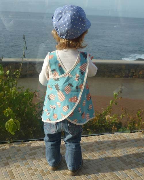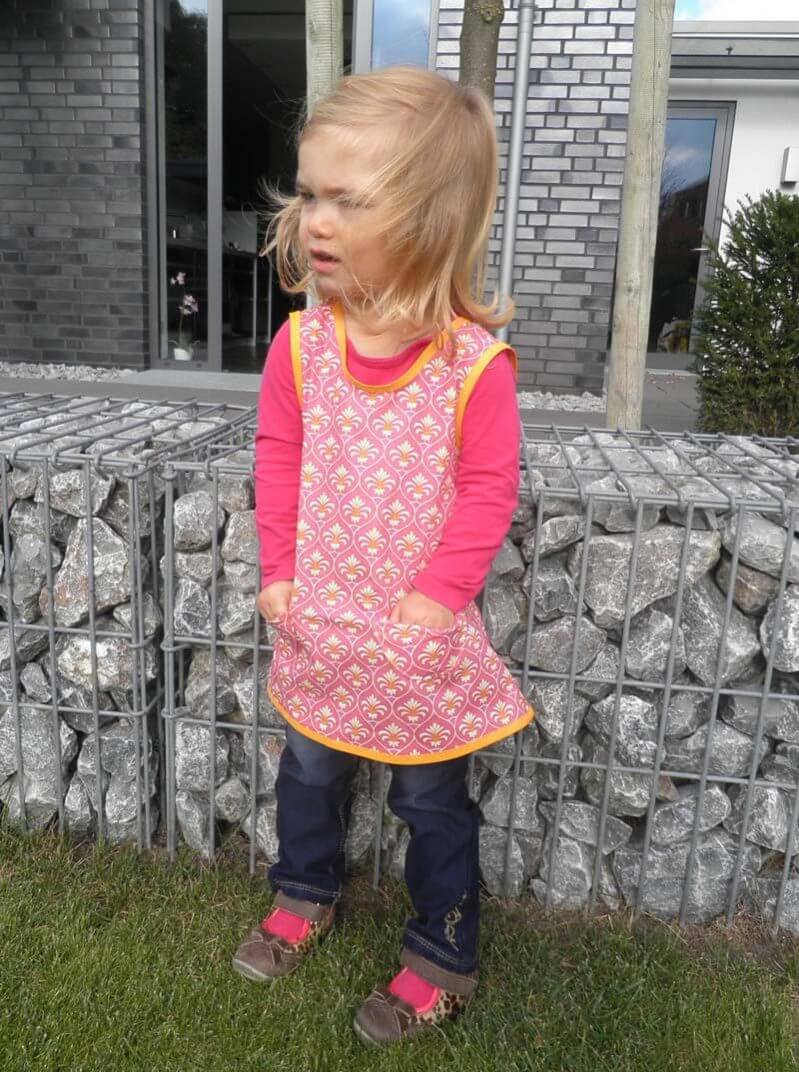 Beide Kleider in Blau am Ende der Bebilderung sind In der Größe 116 genäht. Das kleinere Mädchen trägt 110 und wächst noch rein, das große Mädchen ist mit 128 schon rausgewachsen, kann es aber immer noch gut mit einer kurzen Jeanshose darunter als Oberteil tragen. Das Kind kann das Schürzenkleid also sehr lange anziehen…!