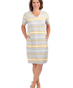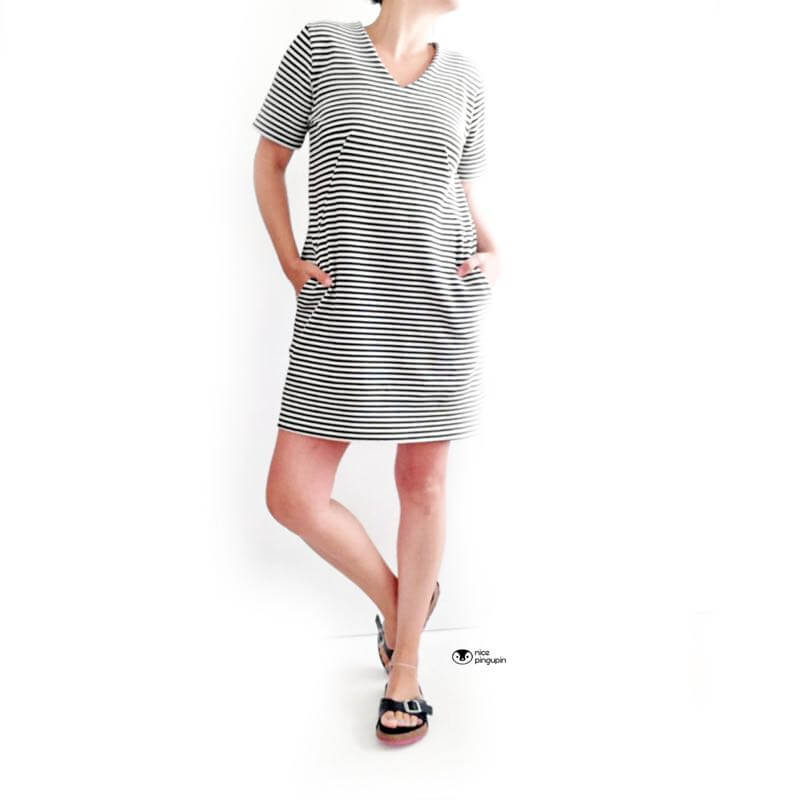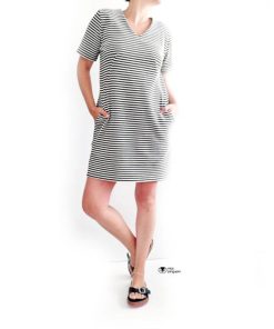 Jerseykleider für Damen nähen! Ein Schnittmuster für ein einfaches, aber schönes Jerseykleid welches durch die im Abnäher eingearbeiteten Taschen raffiniert aussieht. Durch die Auswahl des Stoffes wird das Damenkleid immer wieder anders aussehen. Gerade aus einem Streifenstoff sieht es toll aus, aber natürlich kannst Du auch unifarbene Stoffe verwenden. Wenn Du die Tasche weglässt, ist das Kleid auch für Nähanfänger geeignet.