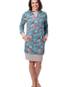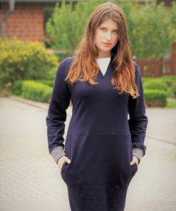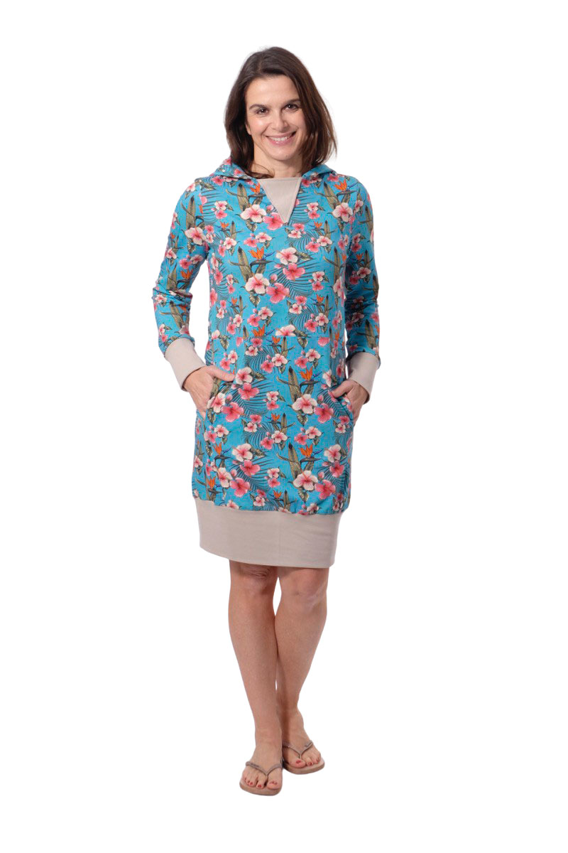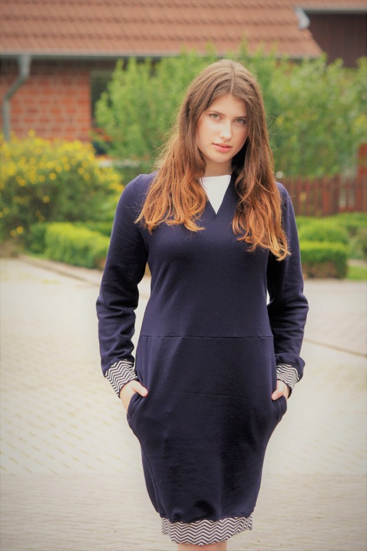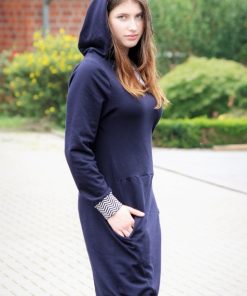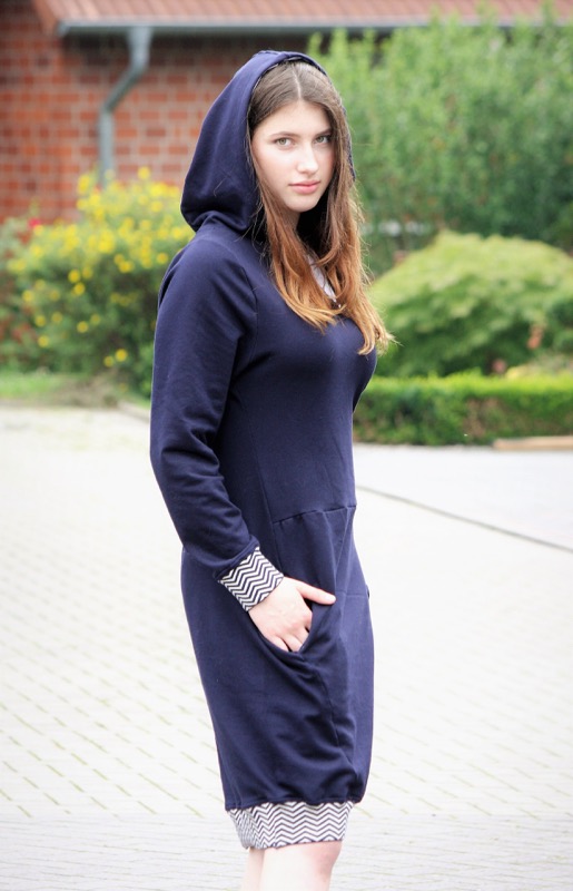 Dies ist ein schönes Hoodiekleid mit raffinierter Taschenlösung, welches durch verschiedene Stoffe immer wieder anders aussehen wird. Dieses Schnittmuster kann auch von Anfängern genäht werden. Ob mit kurzem oder mit langem Arm, als Pullover oder als Kleid, mit oder ohne Taschen…das Schnittmuster ist vielseitig und wandelbar.