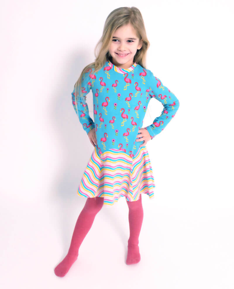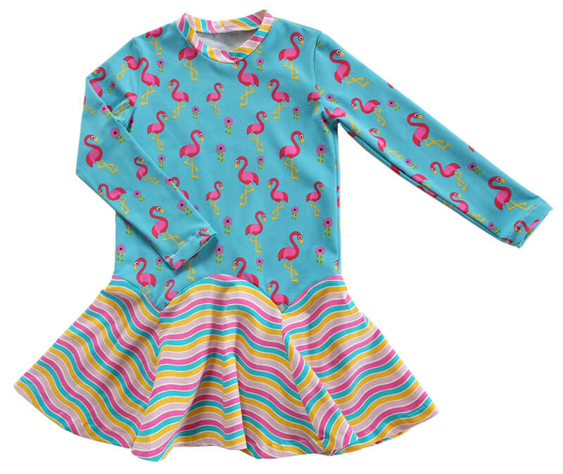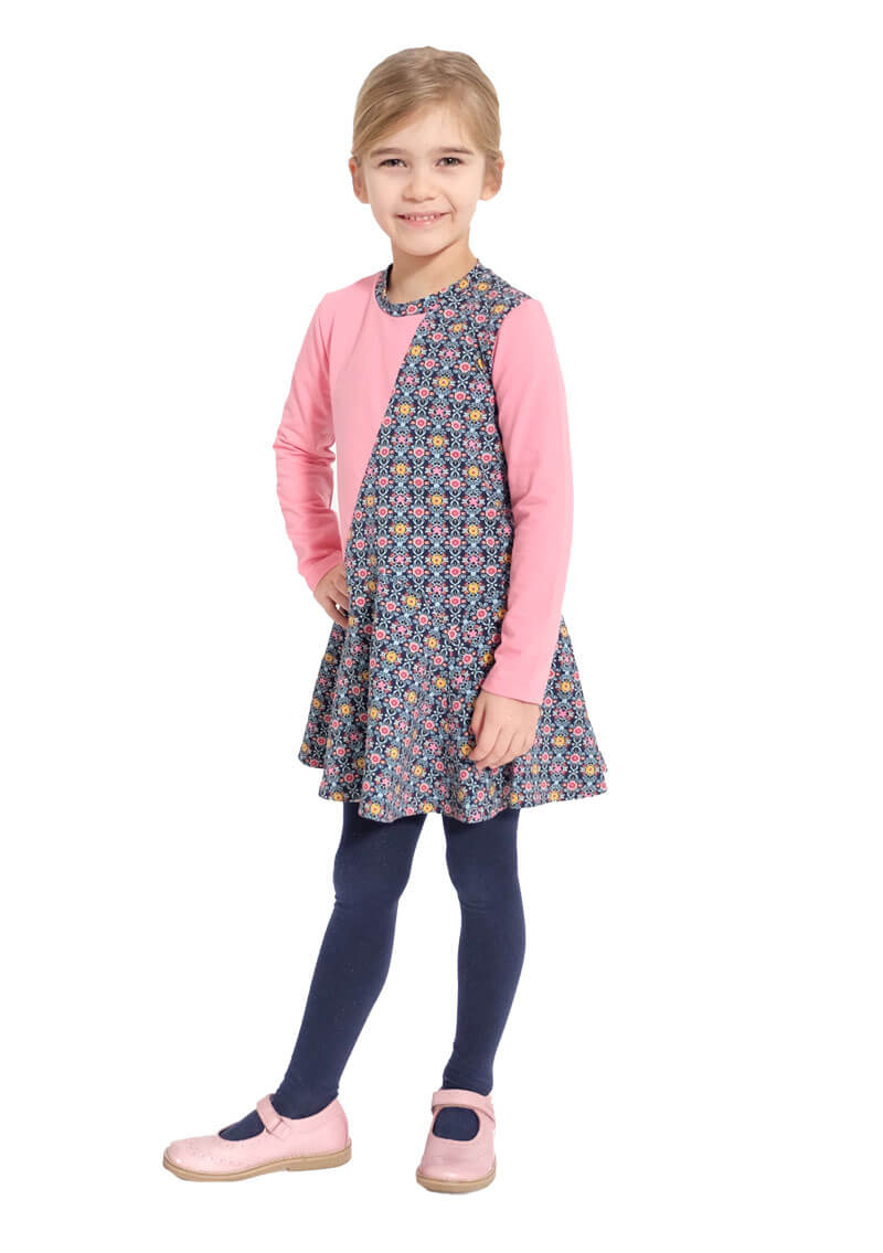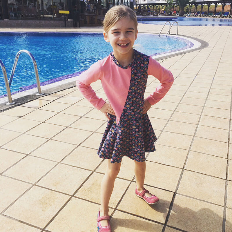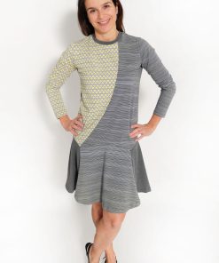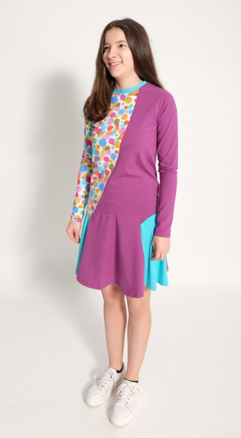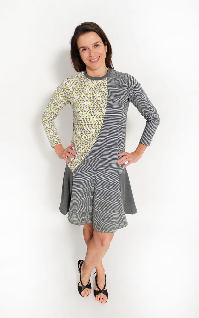 Dieses leger geschnittene Kleid ist sehr variabel. Du kannst das Kleid mit langen oder kurzem Arm, aus einem oder mehreren Stoffen nähen. Es ist auch noch eine zusätzliche Datei für das zweigeteilte Oberteil hinterlegt. Die Variationsmöglichkeiten sind sehr vielfältig. Wer möchte, kann sich das Oberteil verlängern und sich ein Shirt daraus zaubern…) Achtung, der Schnitt ist eher für Fortgeschrittene zu empfehlen, da das Annähen des Rockteils für Anfänger kniffelig sein kann.