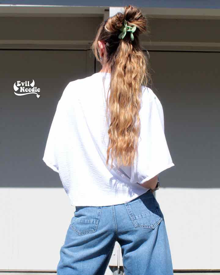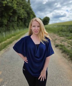 Materialempfehlung: Viskosestoffe oder sehr weich fallende Stoffe. Der Stoff kann unelastisch sein. Sie sollen nicht „kleben“, da das Vorderteil in doppelter Stofflage liegt.