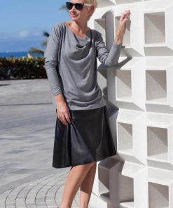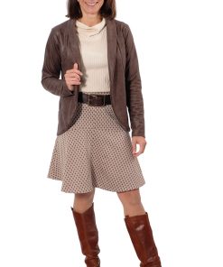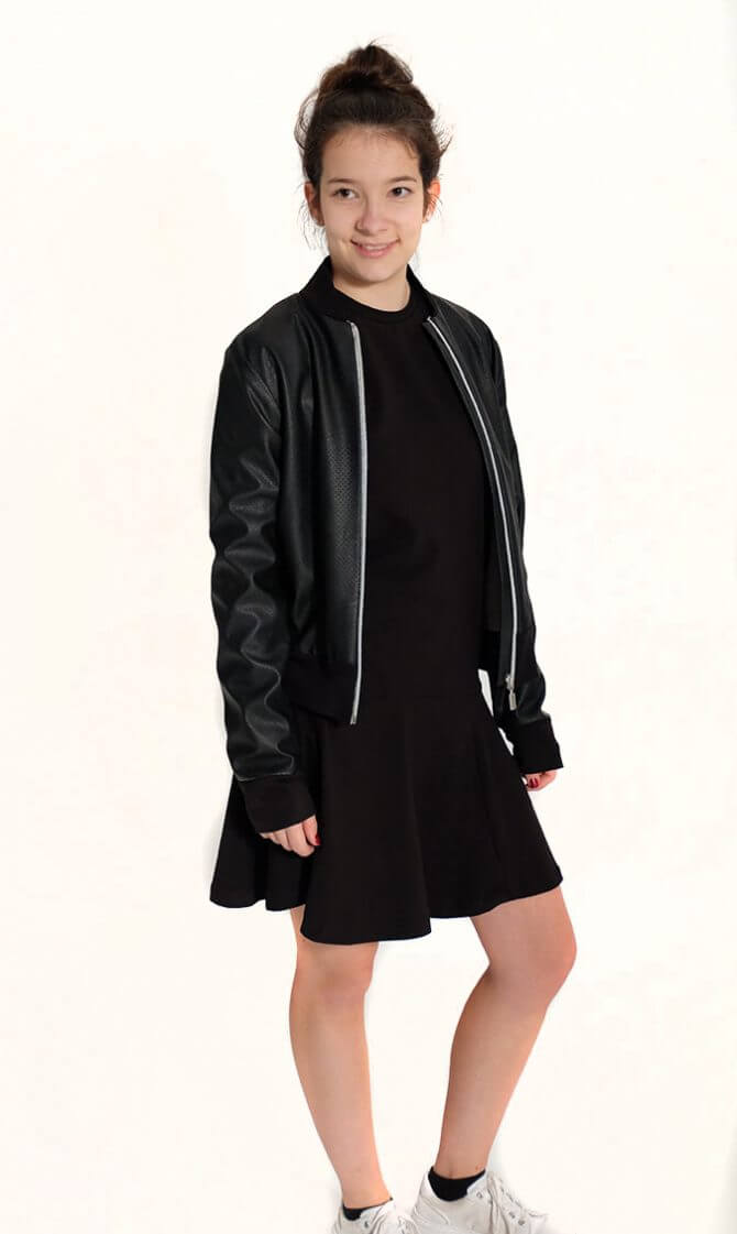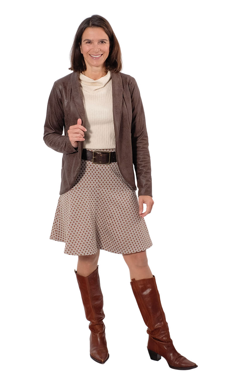 Dieses Kunstleder ist weich und strapazierfähig, somit eignet es sich hervorragend für Hosen, Kleider, Blazerjacken, Jacken, Accessoires, Röcke und vieles mehr. Abbildung Schnittmuster Tasche Pola, Jacke Kiran und Bennie, Rock Laila, und Blazer Lilo zur Inspiration.