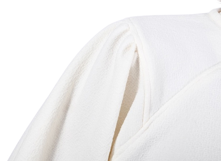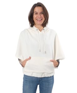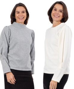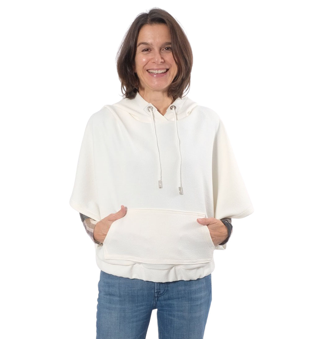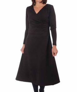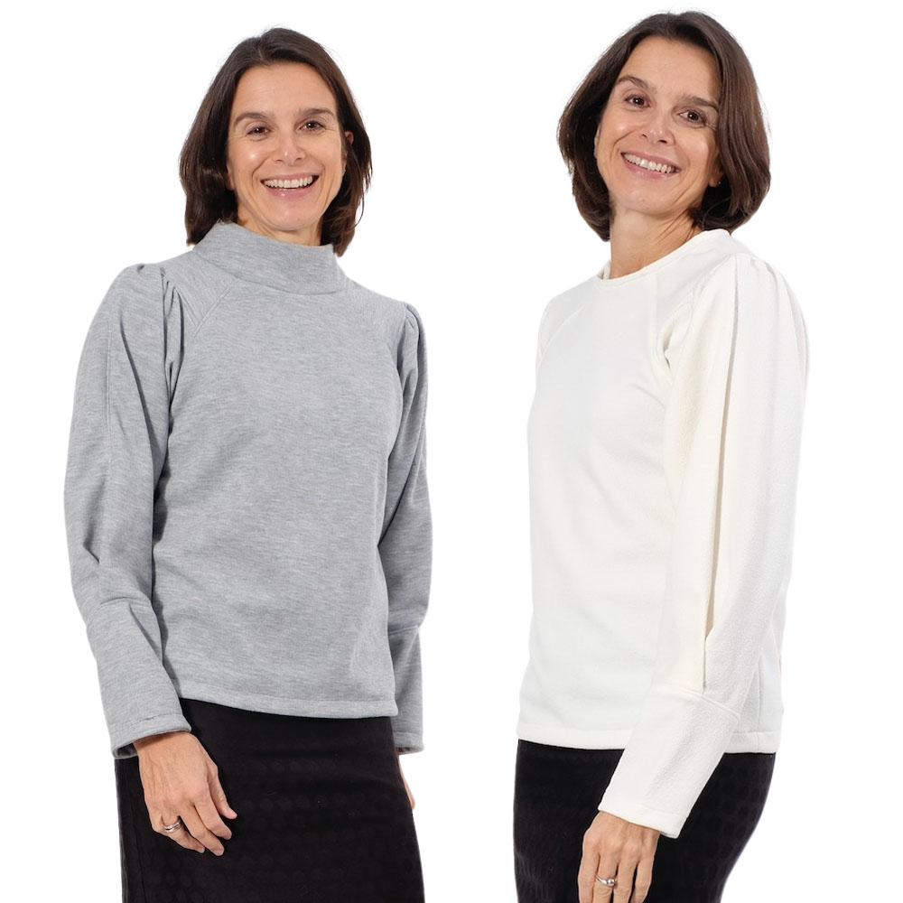 Dies ist ein dehnbares Mischgewebe. Ideal für Oberteile, Röcke, Hosen, Blazer, Cardigans. Abbildung Schnittmuster Wilka und Aurora in Ecru. Kleid Resia in Schwarz.