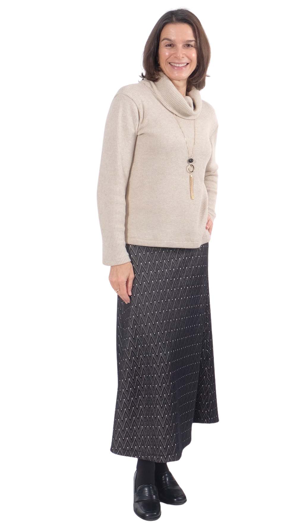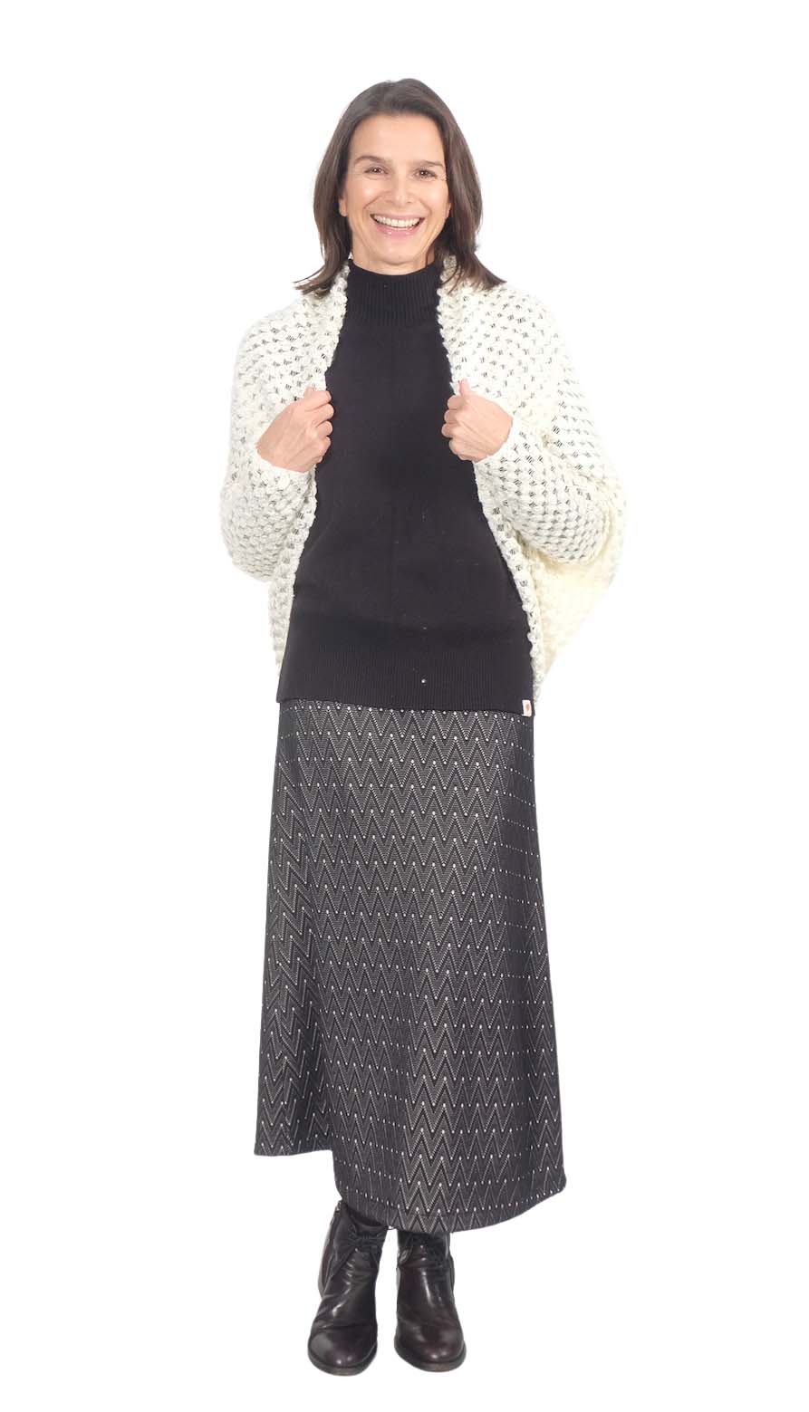 Dies ist ein dehnbares Mischgewebe. Ideal für Röcke, Hosen, Blazer, Cardigans. Abbildung Schnittmuster Rock Ayla. Abbildung Schnittmuster Jacke Tatjana zur Inspiration.