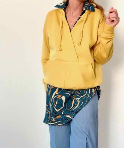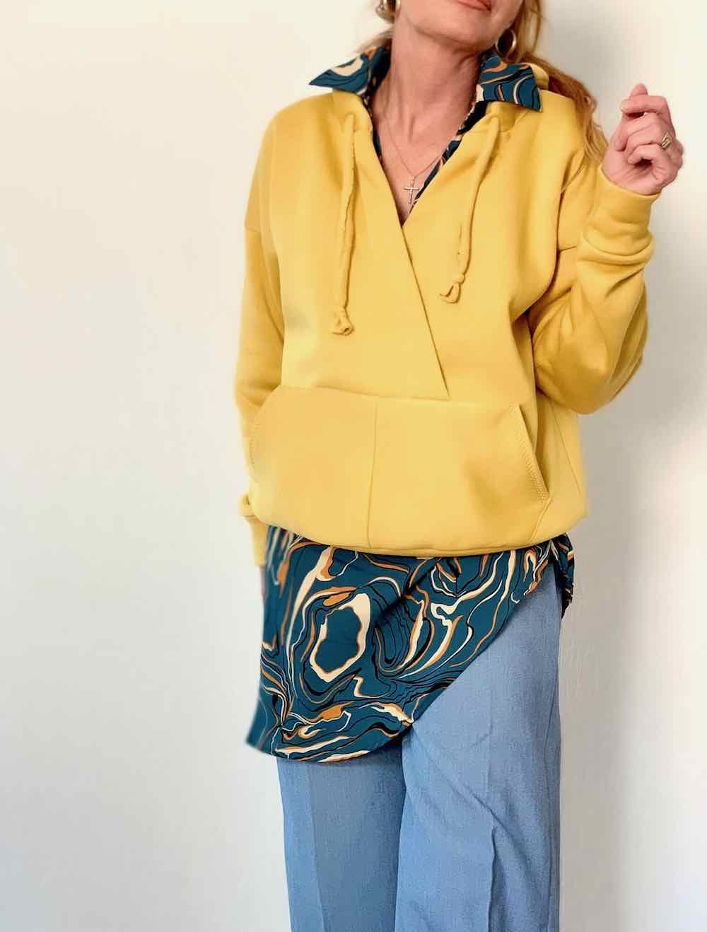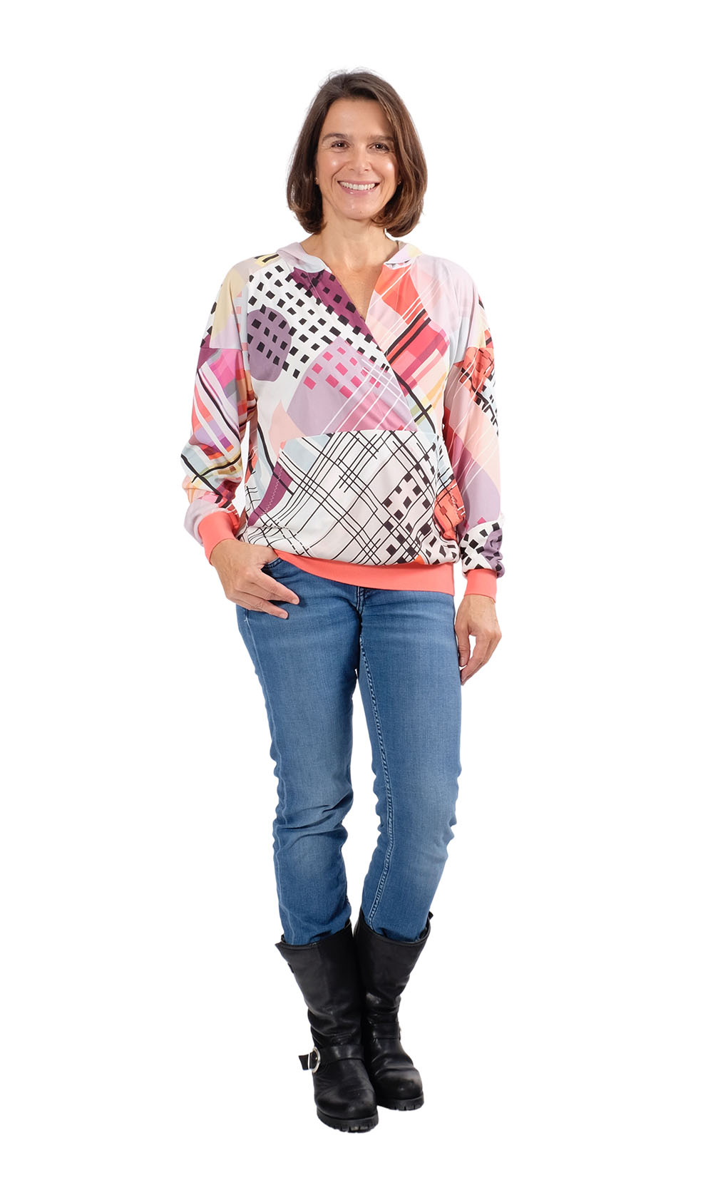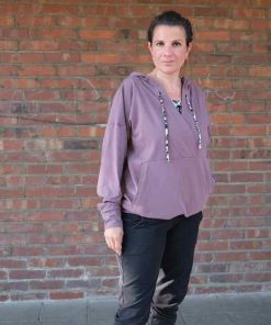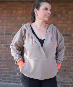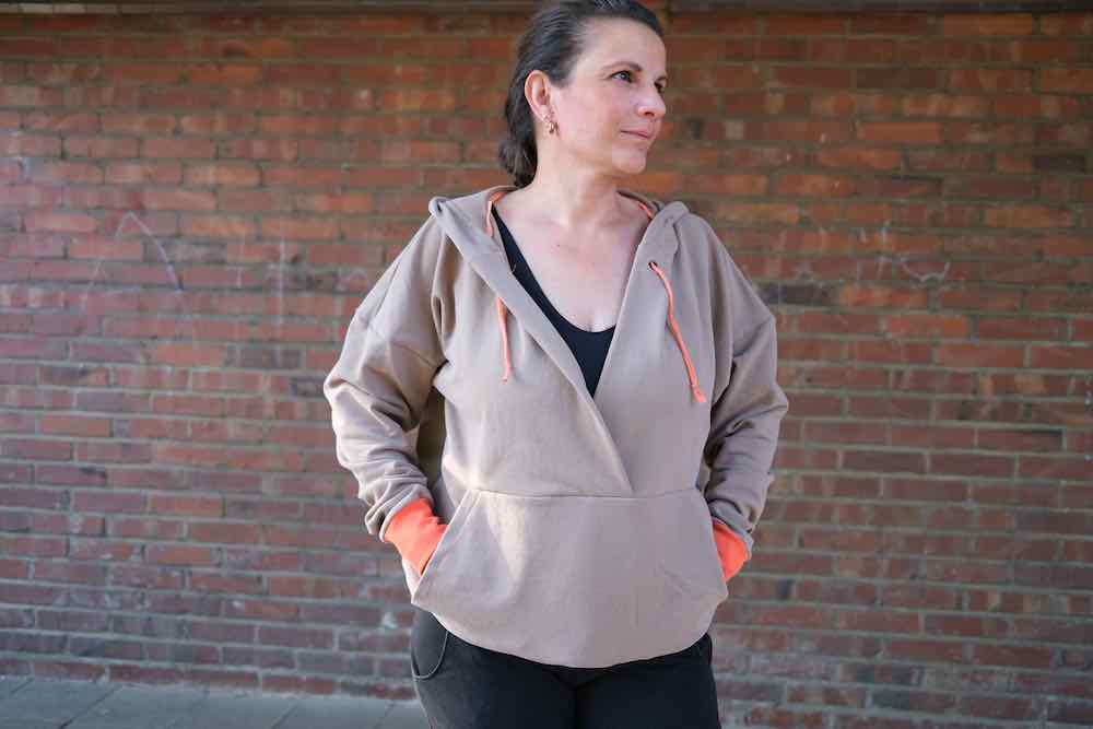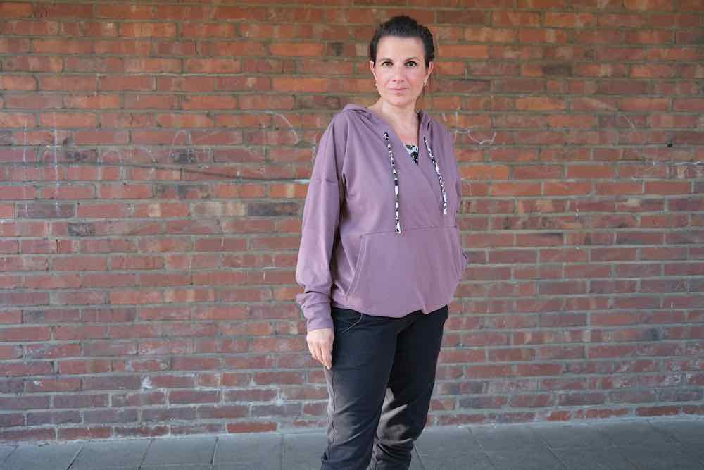Dieser schöne kurze Oversized – Hoodie hat eine raffinierte Ausschnitt und Taschenverarbeitung. Das Schnittmuster ist für blutige Nähanfängerinnen nicht zu empfehlen, ein wenig Jersey-Näherfahrung solltest Du für dieses Shirt schon haben. Das Shirt ist auch super für stillende Mütter geeignet!