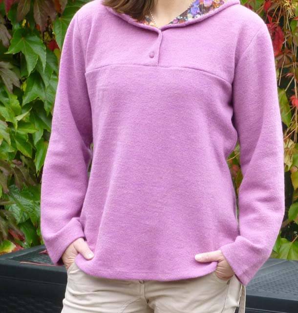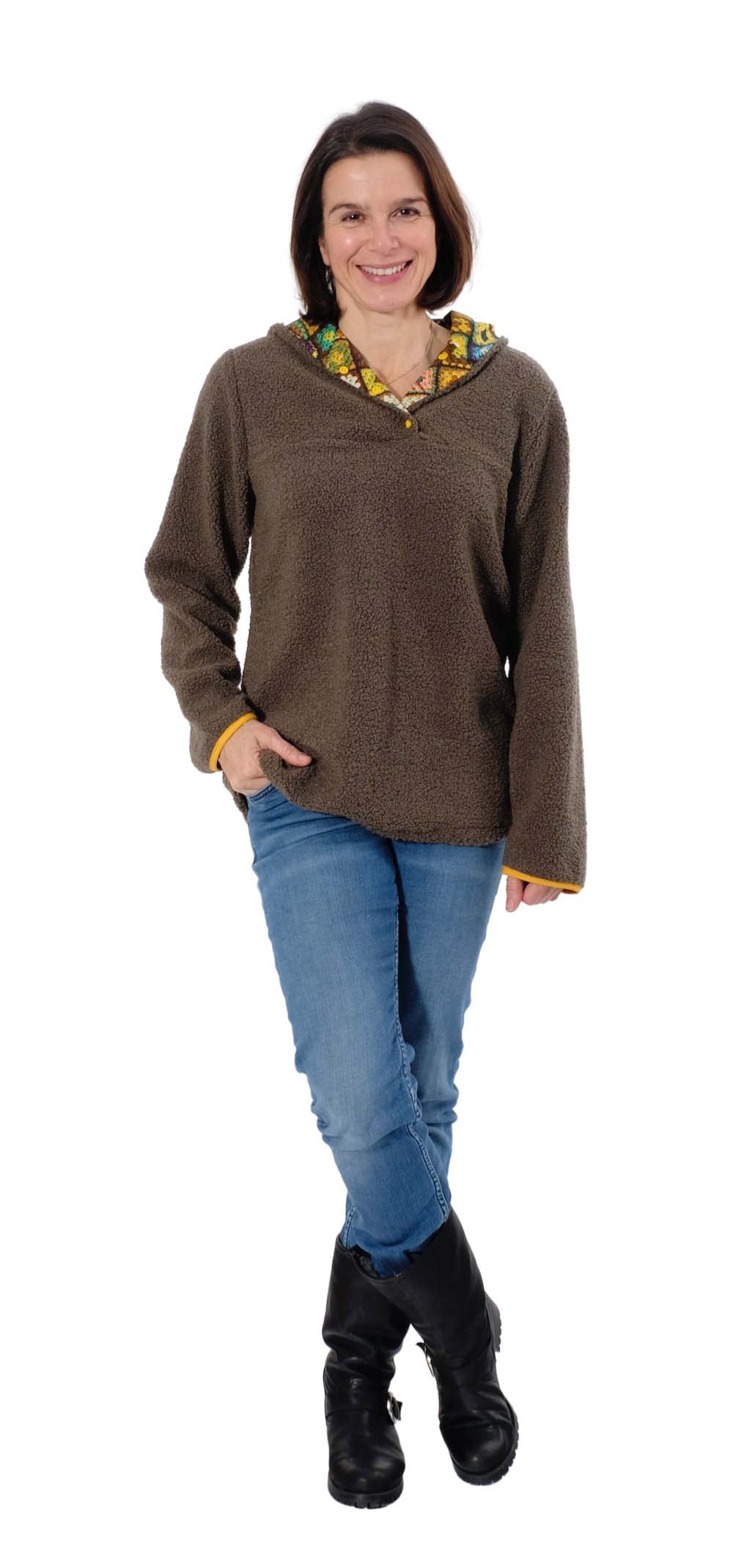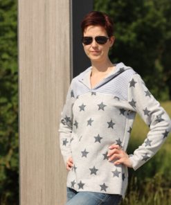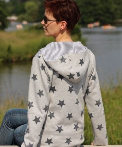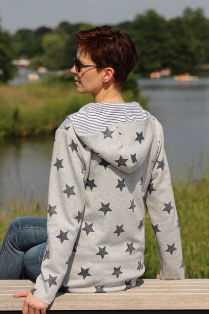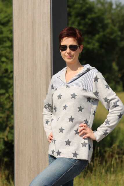 Den Pullover fanden wir für die Kleinen schon so schön, dass wir ihn jetzt endlich auch für die Großen fertig haben. Die spitze Kapuze und die aufgesetzte Tasche sind als separate Datei hinterlegt. Wir finden nämlich, dass hier eine runde Kapuze auch sehr gut aussieht. Du kannst aber beides nähen. Wir zeigen zudem zwei Verarbeitungsvarianten: Mit und ohne Schrägband! Achtung, die Bloggerin Anja Gohr hat sich den Email kreativ mit Reißverschluss und den Taschen von dem Modell Karin abgewandelt. Diese runden Taschen sind im Schnittmuster nicht beinhaltet. Die Bloggerin Suska hat sich den Pullover aus Softshell genäht, siehe hier unseren Hinweis bei der Stoffempfehlung!