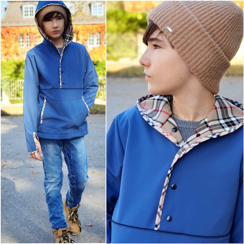 Stoffempfehlung: Fleecestoffe, Sweatshirtstoffe, dickere und dehnbare Stoffe… Für das Futter kann man auch stabile Stoffe verwenden, wir nehmen hier gerne Baumwollstoffe. Du kannst auch einen Softshell Stoff verwenden. Dann aber bitte eine Nummer größer zuschneiden und die Naht an der Kapuze etwas nach unten setzen. Warum? Weil sonst die Öffnung für den Kopf nicht groß genug ist. Einfach das obere Vorderteil um 3 cm verlängern und das untere Vorderteil um 3 cm kürzen. Suska von Schneckenfarm Kinderkram hat dies beim blauen Softshell Pullover getan und auch die vordere Tasche vergrößert.