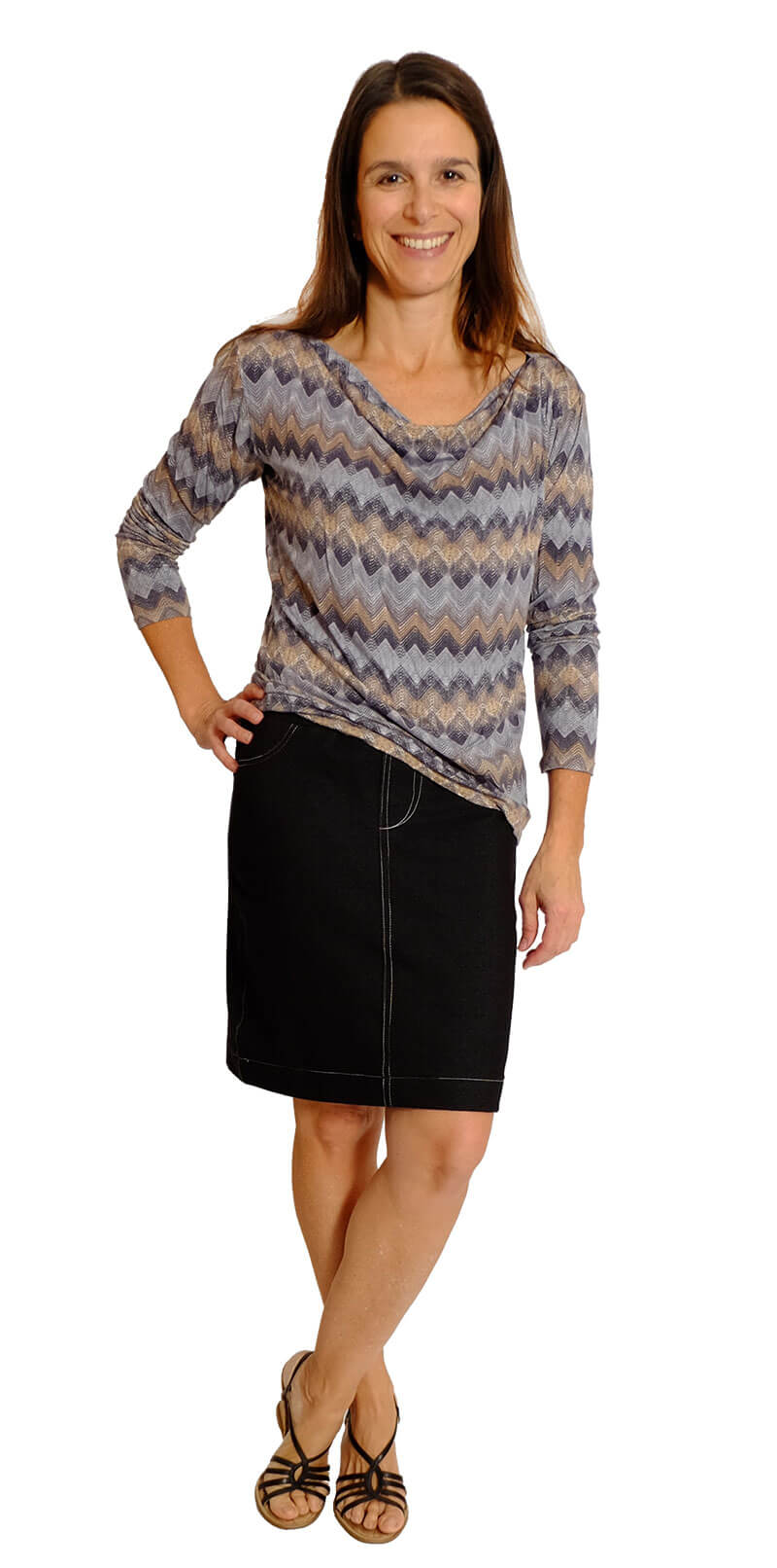 Unser Basic Rockschnitt, der in keinem Kleiderschrank fehlen sollte! Dieser wunderschöne, gerade geschnittene 5-Pocket Rock kann aus allen elastischen Stoffen genäht werden. Damit ist er für das ganze Jahr geeignet.