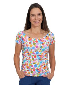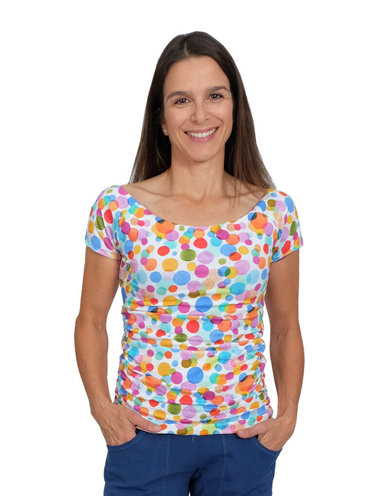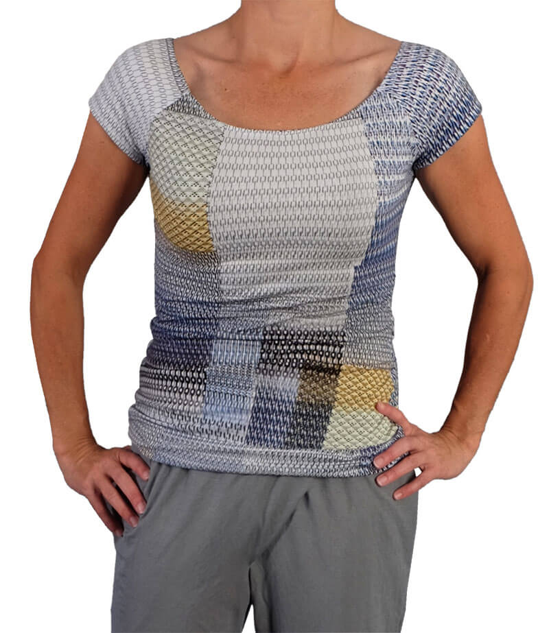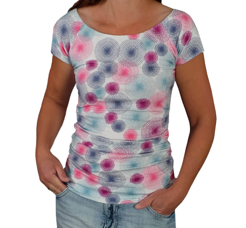 Ein wunderschönes, figurnah geschnittenes Shirt mit einer Raffung an der Seite. Das Shirt wird aus 2 Stofflagen genäht und bekommt dadurch eine tolle Festigkeit. Durch die Auswahl des Stoffes und der Variationsmöglichkeiten entsteht immer wieder ein neuer Look. Das Shirt ist eher für Fortgeschrittene zu empfehlen. Das Nähen ist vom Prinzip her nicht schwer, nur darf bei der Verarbeitung von elastischen Stoffen am Ausschnitt nichts verzogen werden.