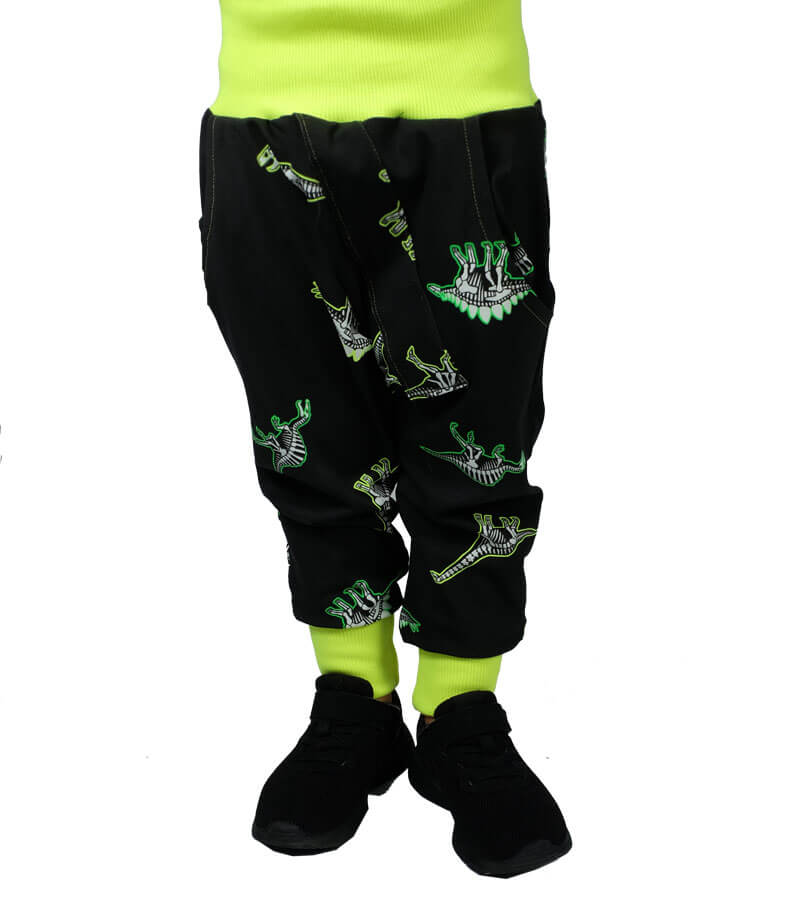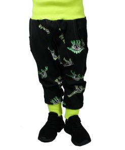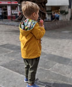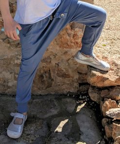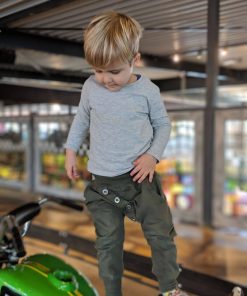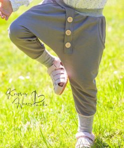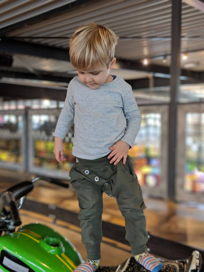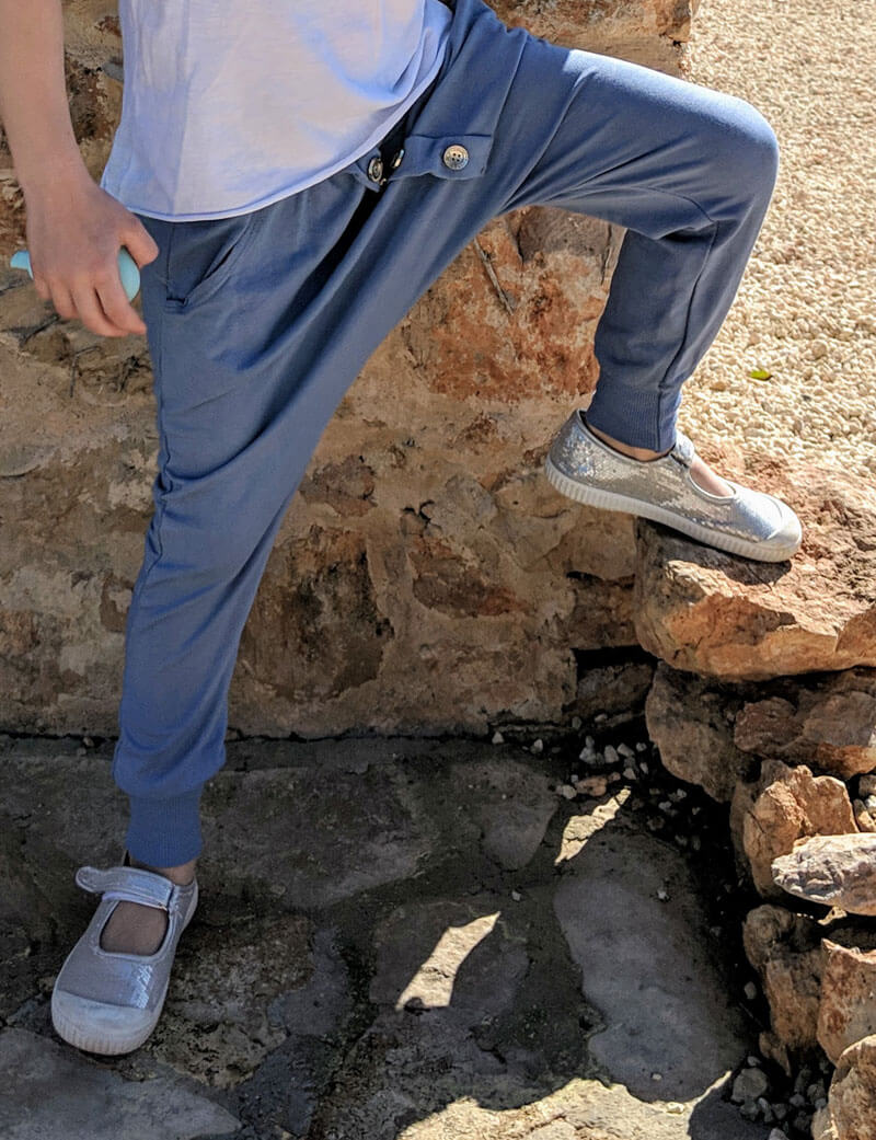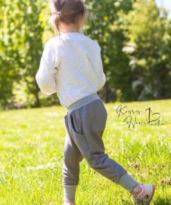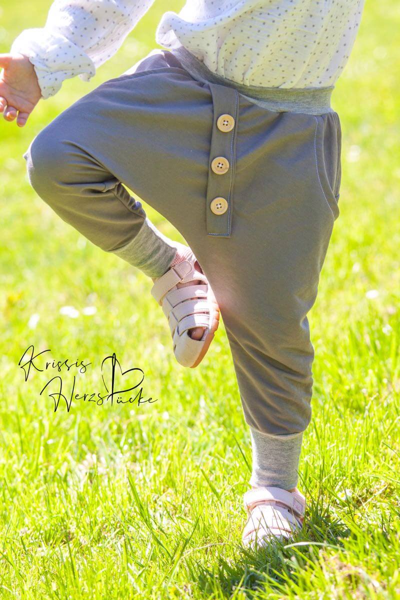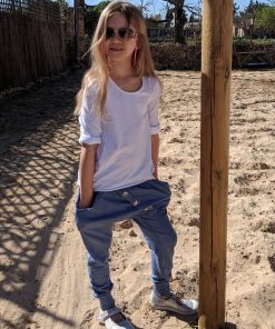 Diese unkomplizierte Hose mit tiefem Schritt ist eine tolle, lässige Hose für Jungs und Mädchen. Die aufgesetzte Leiste mit Knöpfe macht die Hose zu einem echten Hingucker. Ihr könnt die Hose auch mit Bändern auf der Seite verarbeiten, hier ein schönes Beispiel von Nadine in Kombination mit dem Schnittmuster Jacke Josh und Bluse Justine.