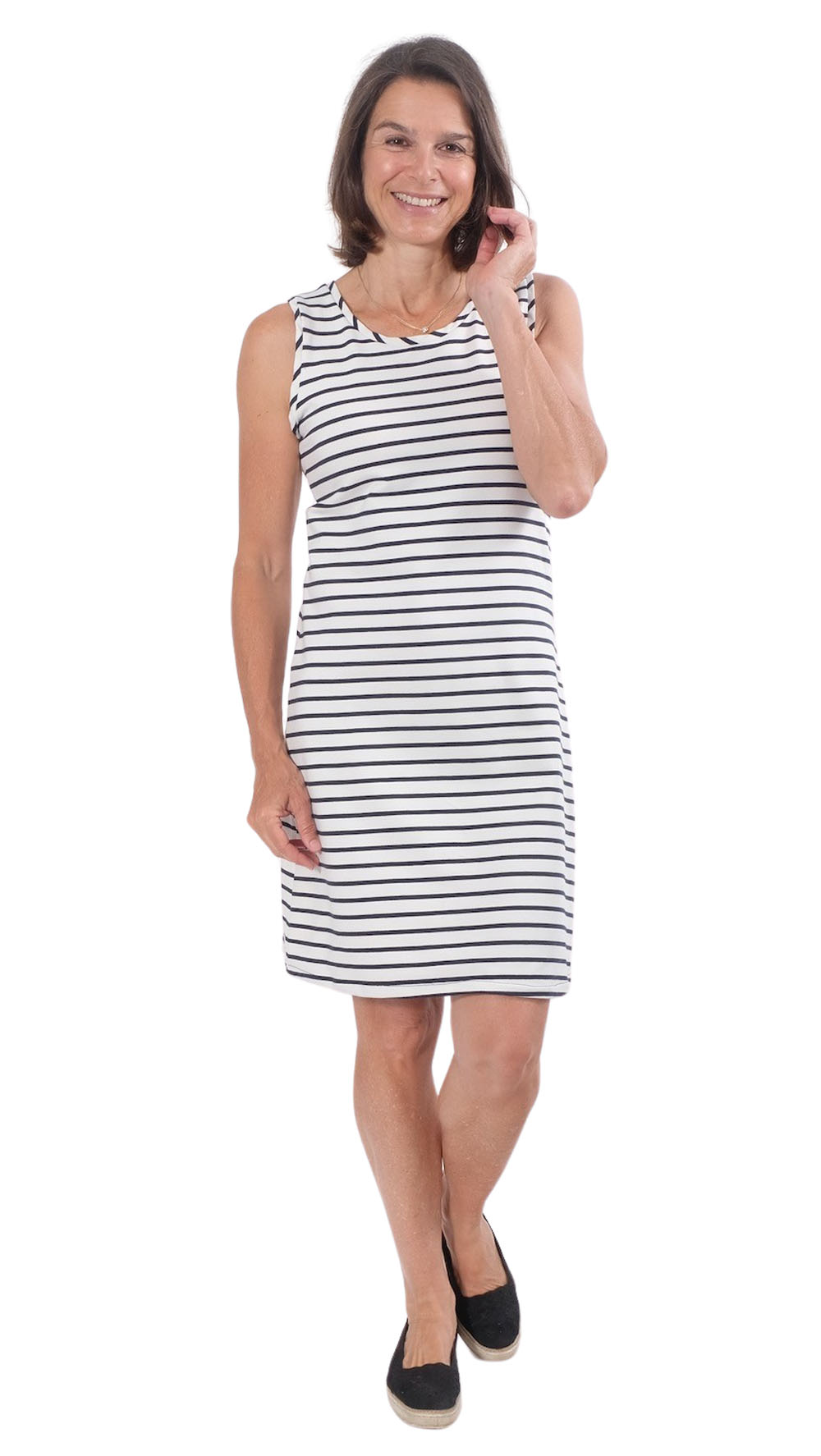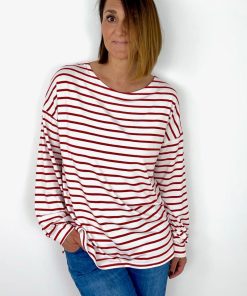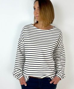 Ein hochwertiger French Terry Stoff aus Baumwolle/Elasthan in einem hellen Ecru. Die Innenseite ist nicht angeraut. Ideal für Shirts, Hosen, Röcke und Kleider. Abbildung Kleid Tanja, Shirt Diana und Troyer Jasper in blauer und roter Farbstellung.
