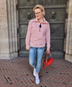 Ein hochwertiger French Terry Stoff aus Baumwolle/Elasthan in einem hellen Ecru. Die Innenseite ist nicht angeraut. Ideal für Shirts, Hosen, Röcke und Kleider. Abbildung Kleid Tanja, Shirt Diana und Troyer Jasper in blauer und roter Farbstellung.