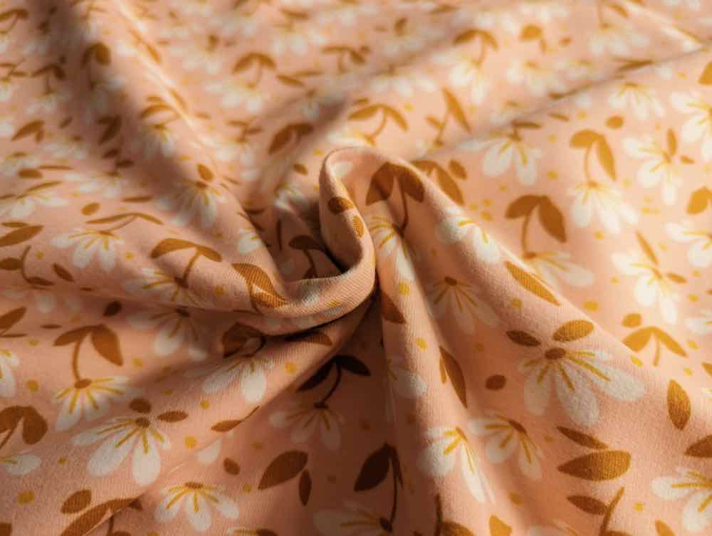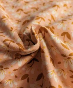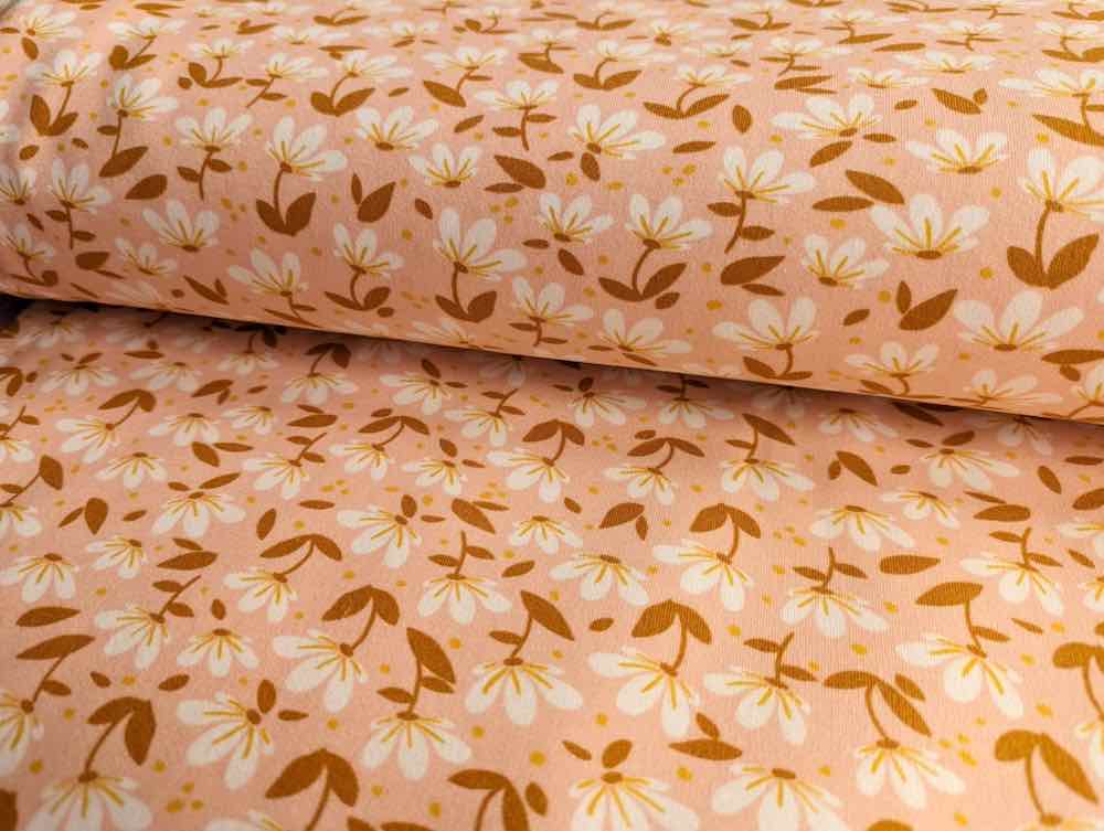 Ein hochwertiger Sweatshirtstoff mit Blumen auf Lachs / Rosa. Das Material ist ideal für Shirts, Kleider, Hosen, Röcke, Pumphosen und Oberteile.