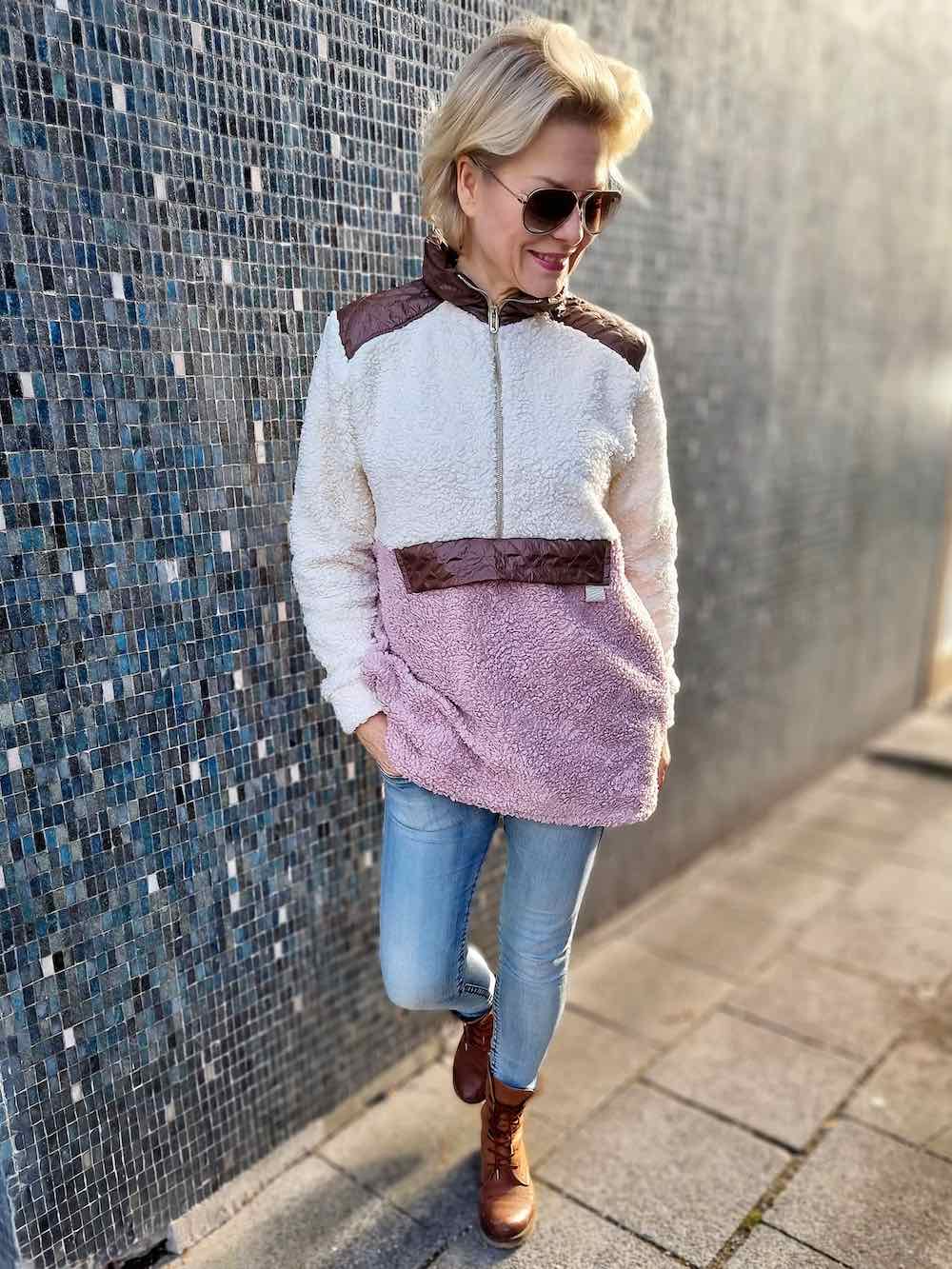 Stoffempfehlung für diesen Style: Dehnbare, dickere (Teddy) Stoffe mit etwas Stand. Wir haben hier festere Sweatshirtqualitäten mit Teddyoptik und einen dehnbaren Boucle Stoff aus Polyester verarbeitet. Vom Prinzip her könnt Ihr aber alle dehnbaren Stoffe verwenden, zu dünne Stoffe eignen sich hier nicht.