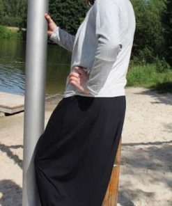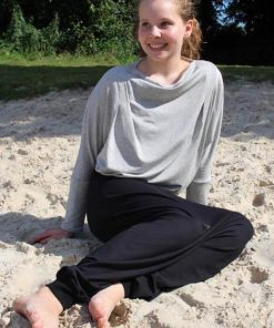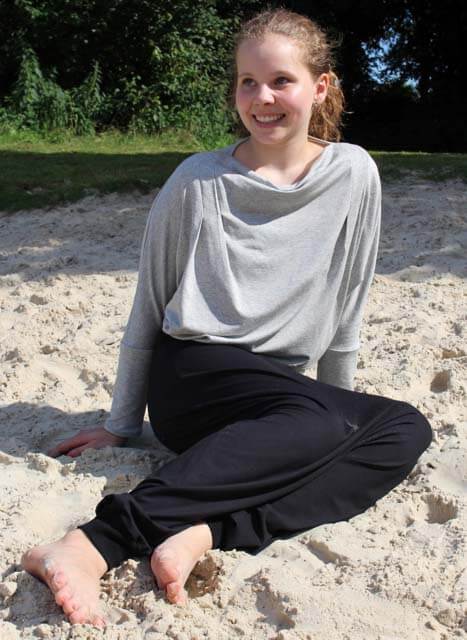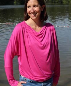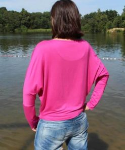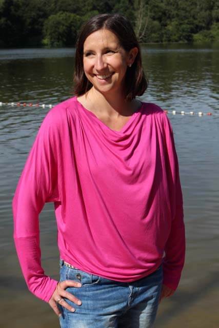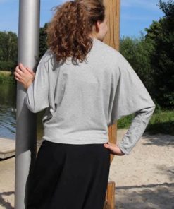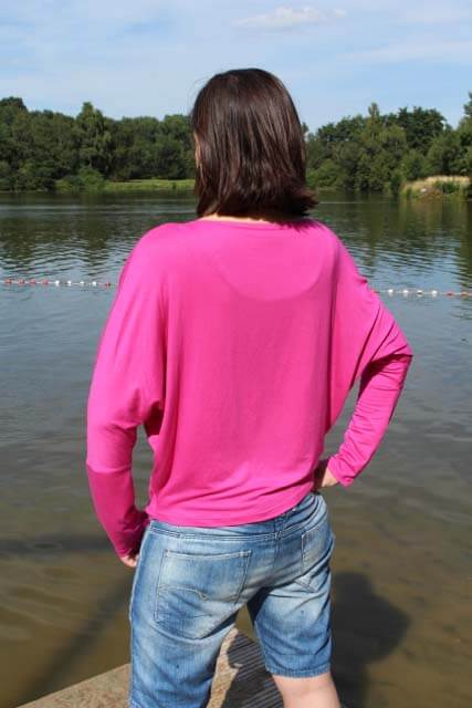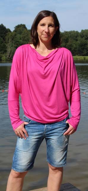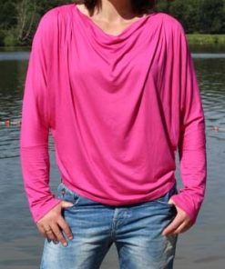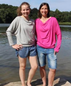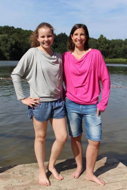 Das Shirt sieht nicht nur hübsch aus, es ist auch recht einfach genäht… Das Shirt hat an jeder Schulter 2 kleine Falten, die dem Modell einen ganz besonderen Look und Style geben. Es fällt durch die Weite und angeschnittenen Ärmel besonders leger. Im Schnitt haben wir noch einen Bund integriert, so dass Du es auch als Longshirt tragen kannst. Das Wasserfallkragen Shirt ist ein tolles Projekt für Fortgeschrittene, denn es sollten hier wirklich nur sehr weich fallende Stoffe verwendet werden. Das könnte für Anfänger etwas schwieriger sein. Natürlich kann man auch Baumwolljersey nehmen, das Shirt wird aber dann ganz anders fallen, da der Stoff mehr Stand hat als ein feiner Strickstoff oder Viskosejersey.