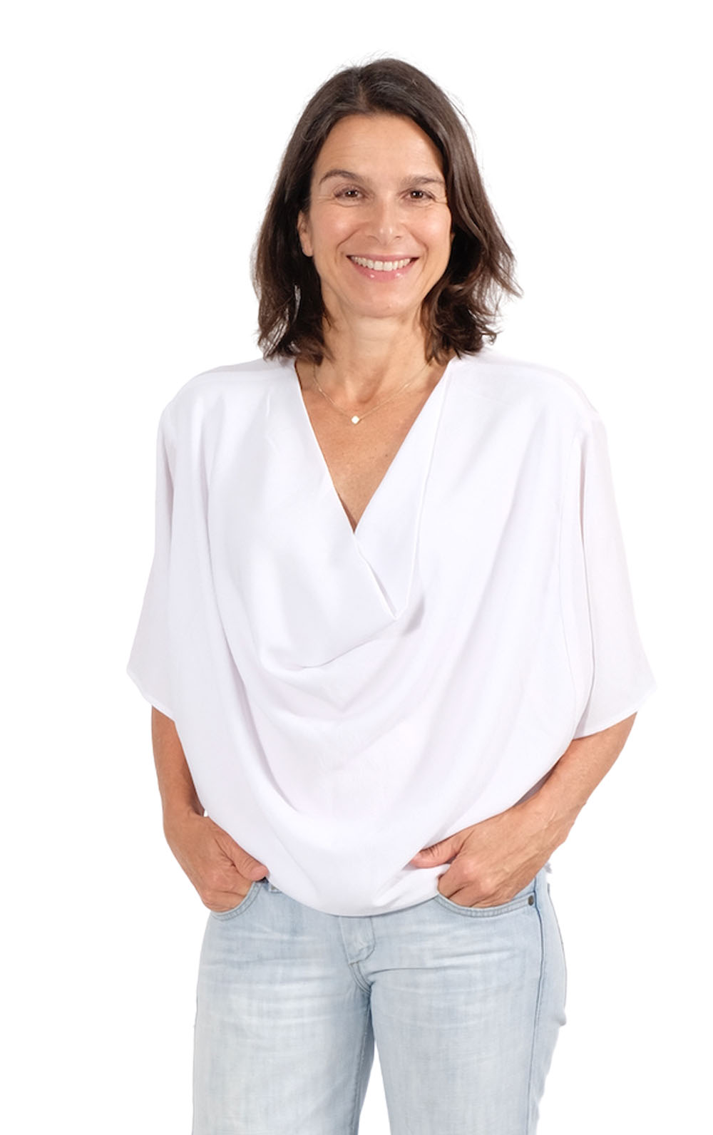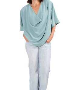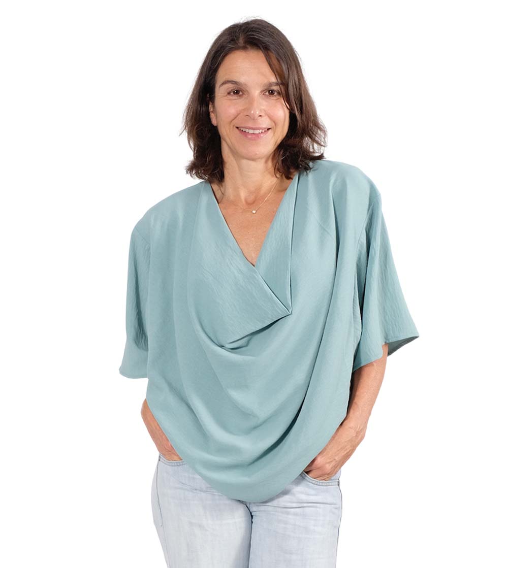 Stoffempfehlung für diesen Style: Viskosestoffe oder sehr weich fallende Stoffe. Der Stoff kann unelastisch sein. Sie sollen nicht „kleben“, da das Vorderteil in doppelter Stofflage liegt.