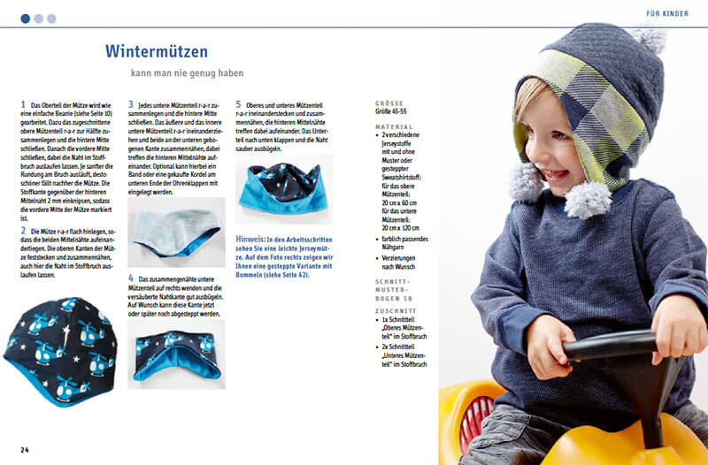 Ein weiteres Nähbuch ist erschienen, diesmal im Taschenbuchformat 17,5 cm x 21,5 cm. In dem Nähbuch sind Mützen für die ganze Familie auf 46 Seiten beinhaltet. Mamas, Papas, Babys, Kindergartenkinder, Schulkinder und Teens – die ganze Familie liebt coole Mützen. Nähe Dir die Kopfbedeckungen aus dem Trendmaterial Jersey einfach selbst. Labels, Applikationen, Paspelbänder, tolle Plottermotive und vieles mehr sorgen für Abwechslung und einen unverwechselbaren Look. Im Buch sind noch viele weitere Variationen und Mützen enthalten als abgebildet. Es gibt on Top noch 10 Plottermotive zum Downloaden.